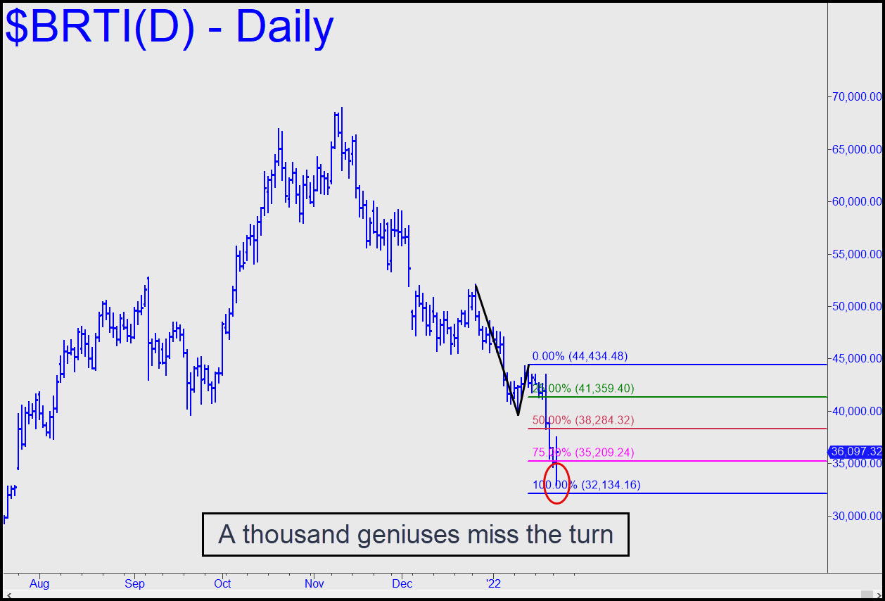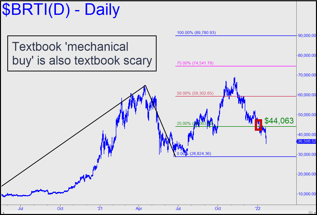 BRTI triggered a ‘mechanical’ buy when it fell to the green line at $44,063 earlier this month. I didn’t recommend the trade however, because the ‘camouflage’ set-up we would have used to get long never ripened the way we prefer. Good ‘mechanical’ opportunities are supposed to feel scary at the time they are signaled, since the best of them usually features a plunge back to the green line that is meant to disembowel bulls who have bought C-D ‘follow-through’ legs too recklessly. This pattern surely qualifies as a hair-raiser. However, that in itself makes it theoretically appealing, even if not textbook perfect. The C-D leg died in the right place, but the imputed power of the A-B impulse leg was diminished by heavy choppiness near its top. Even so, I’d rate the trade a ‘7.4’, well above the 7.0 threshold where we tend to go for it. I see no reason at the moment to go for much of anything, however, since the ‘C’ low at $28,824 will have become magnetic by now. ______ UPDATE (Jan 24, 8:58): How cute. The turn from just north of a neon target at 32,134 occurred with no one aboard, but with a lesson to offer: Now we know that Bertie-watchers are so fixated on obvious ABCD patterns that we can’t use them anymore. The attractive head-and-shoulders still needs lower lows exceeding $30,000 to look gorgeous.