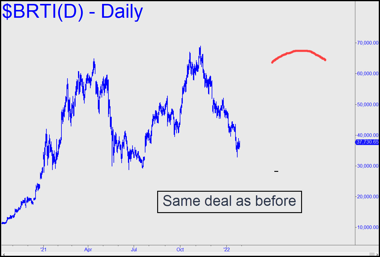 Bertie’s constipated price action does not warrant any changes in the chart previously shown here. We see a large, potentially gorgeous head-and-shoulders top forming that could continue to evolve until April or May. It’s hard to believe the bull market will last that long, but we’ll give this scenario the benefit of the doubt, since what else do we have to sustain our interest in bitcoin when it is in a cooling-off period that is about to enter its second year? I will supply trading guidance in the chat room if the interest is there. For now, use the neckline just below 30,000 as a minimum downside objective for the bear cycle begun from 69,000 in November. _______ UPDATE (Feb 1, 5:55 p.m.): Bertie has become gutless — a go-along trading vehicle that at the moment is docilely trailing the short squeeze in the broad averages. ______ UPDATE (Feb 2, 9:03 p.m.): …and now it is following index futures lower, in high-beta fashion. ______ UPDATE (Feb 3, 10:05 a.m.): Bertie has triggered a ‘conventional’ short down to 28,742, but bears shouldn’t look for a quick payoff. There are no sellers, only a relative dearth of buyers, so any bleed-out will necessarily come from an accretion of paper cuts.