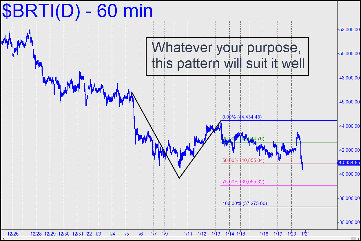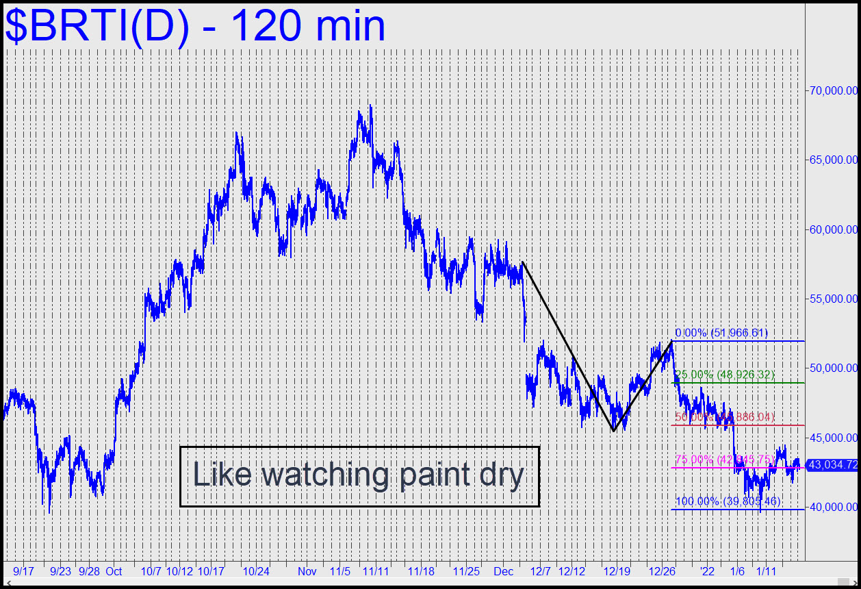 Bertie has turned leaden, transforming a once-exciting chart into one that might be mistaken for that of a company in the hosiery business. The bitcoin proxy bounced nearly $5000 from within a split hair of a Hidden Pivot at 39,805 that I’d drum-rolled, but the move lost steam last week, portending a possible test of the 39,666 low. ETHE, a vehicle traded in lieu of this one, looks even worse, having broken the neckline of a head-and-shoulders pattern projecting to as low as $20; it currently trades for around 27.50. The subsequent rally has been weaker than we might have expected, but we’ll give DaBoyz another crack at it this week, since all they’ve got to do to make bitcoin scream is step away from the offer for a day or two. ______ UPDATE (Jan 20, 7:54 p.m.): Here’s a fresh view with a 37,275.61 downside target. The pattern is sufficiently gnarly that you can expect it to work no matter what your purpose.