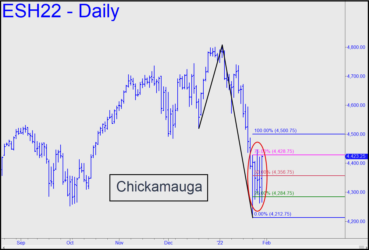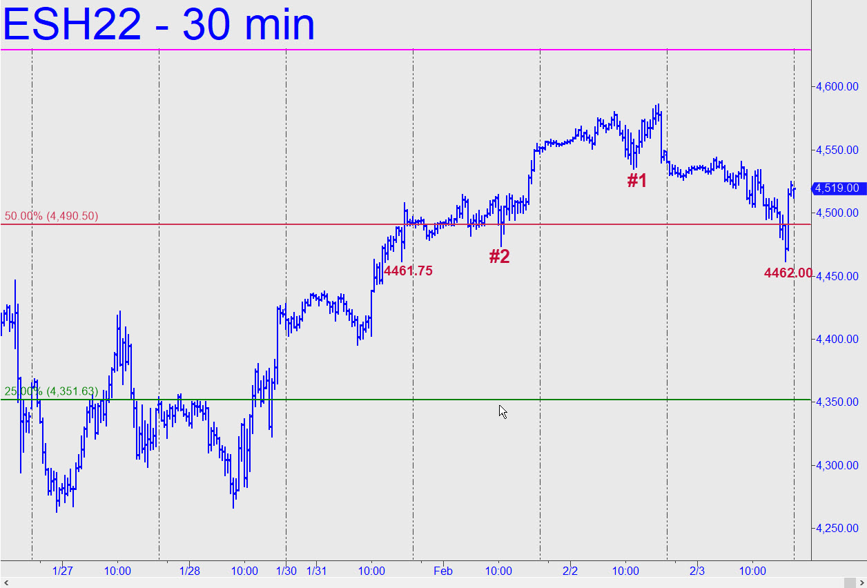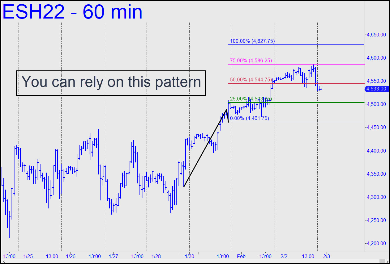 Last week’s elongated bars imply bulls and bears were more or less evenly divided as they fought for their respective lives near the bottom of January’s plunge. You can use the 4500.75 ‘D’ target of the reverse pattern shown as an upside target as the week begins, but I am not recommending shorting there unless with ‘camouflage’ cover limiting your risk to no more than relative pocket change. The pattern worked well for ‘mechanical’ bids at the green line, but using it again will likely be pushing your luck. ______ UPDATE (Jan 31, 7:43 p.m.): ES poked its snout above the 4500 target for a few minutes, then pulled back to cruising altitude so that DaBoyz can await further instruction. It will come via the desertion of sellers, short-covering bears uncomfortable with the recalcitrance of the pullback or, most likely, a combination of both. ______ UPDATE (Feb 1, 5:40 p.m.): The way bears have obligingly placed their testicles in Mr. Market’s vise could make one wonder how on earth the bull market will ever end. DaBoyz twiddled their thumbs for most of the session, effortlessly holding stocks aloft until shorts capitulated in the final hour. The latter now look like dead ducks — worse than dead ducks, actually, since they are probably hoping tomorrow will somehow be different. _______ UPDATE (Feb 2, 8:56 p.m.): Use this sumptuously gnarly pattern for all purposes — and yes, it does imply a ‘mechanical’ bid at x=4503.25 is warranted if you know how to ‘camo’ your way aboard for no more than $800 of theoretical entry risk (on four contracts). ______ UPDATE (Feb 3, 9:35 p.m.): The futures are in a steep short-squeeze following after-hours news that business is just hunky-dory at Amazon. Wall Street is crazy for companies that show sufficient pricing power to sodomize their customers, and so traders lost no time bidding up Amazon shares on word that Prime will soon cost $139, up very substantially from the current $119. Even so, don’t expect this rally to get very far, since news-driven, criminally managed price spikes almost never do.