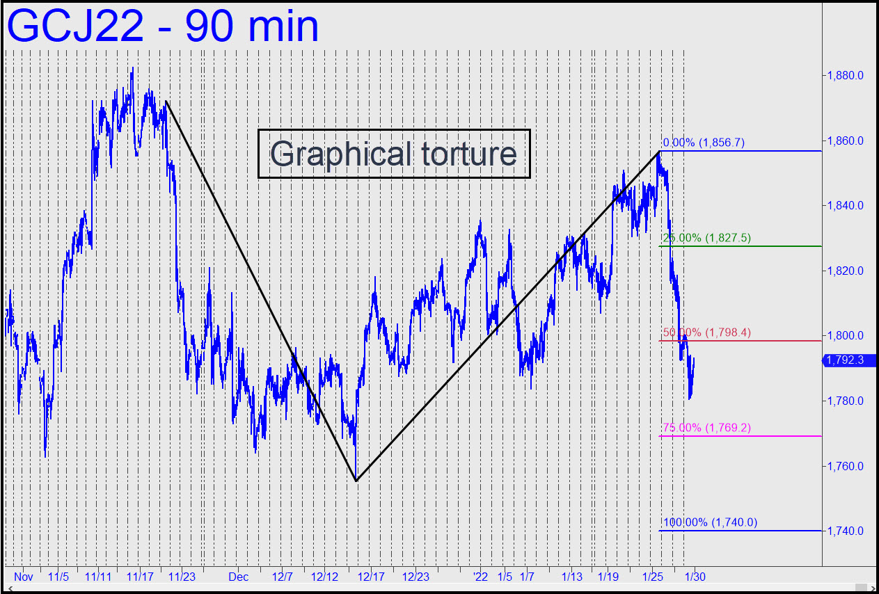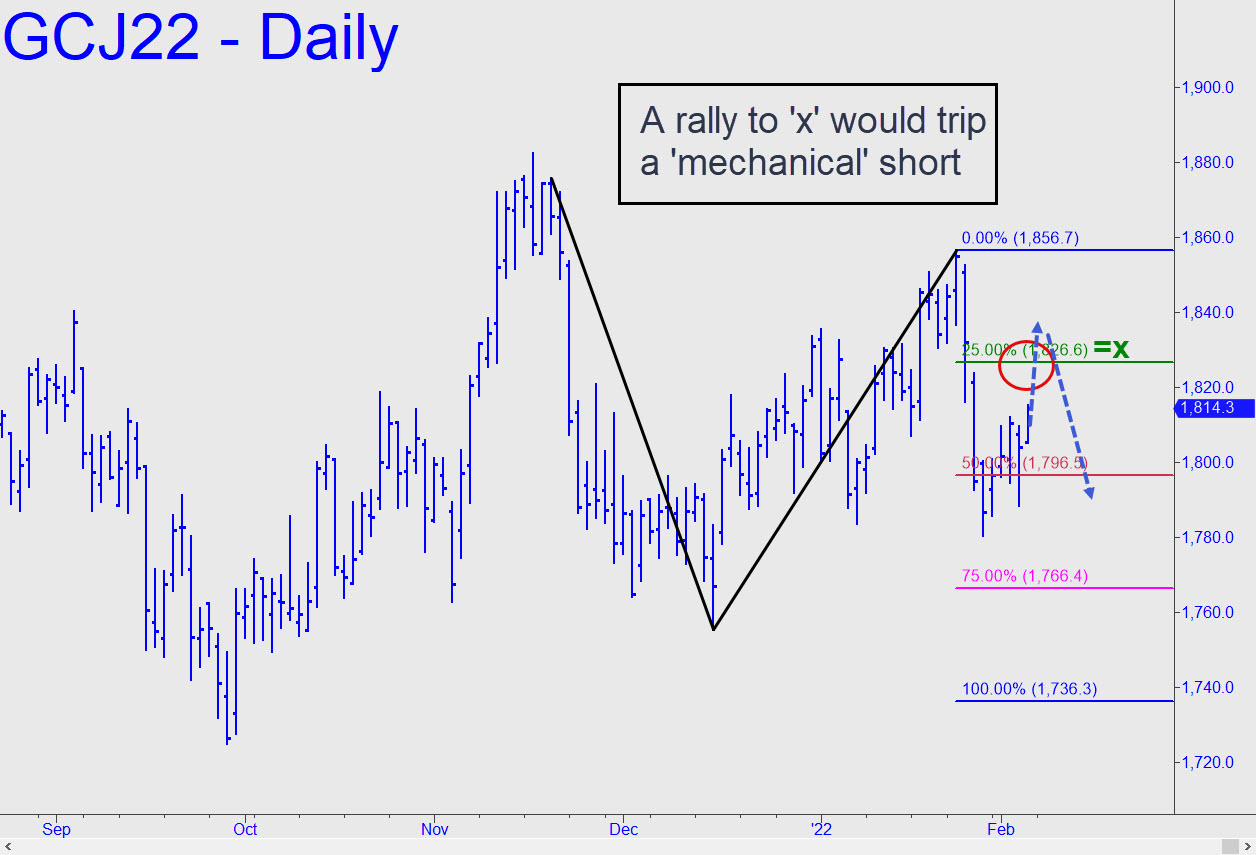 The tortuous pattern shown should be serviceable for now, although we have come to expect gold’s nasty, gratuitous dives to fall short of their ‘D’ targets — in this case 1740.00. The p2 secondary pivot (p2) at 1769.20 is another matter, however, and it should be used to attempt bottom-fishing with a tight stop-loss. Specifically, I’ll suggest managing the trade with a reverse pattern where a=1836.80 on 1/25 at 6:00 a.m. EST. Theoretical entry risk will be around $500 per contract, so this one is not recommended for novices. _______ UPDATE (Feb 4, 8:22 a.m.): Gold’s moves in either direction are 100% gratuitous but tradeable nonetheless. Although the April contract failed to dip to the secondary pivot where we’d planned to do some bottom-fishing, the current rally will become ‘mechanically’ shortable if and when it touches x=1826.60. With about $12,000 of theoretical entry risk on four contracts, this gambit calls for a deft ‘camouflage’ touch. Here’s the chart.