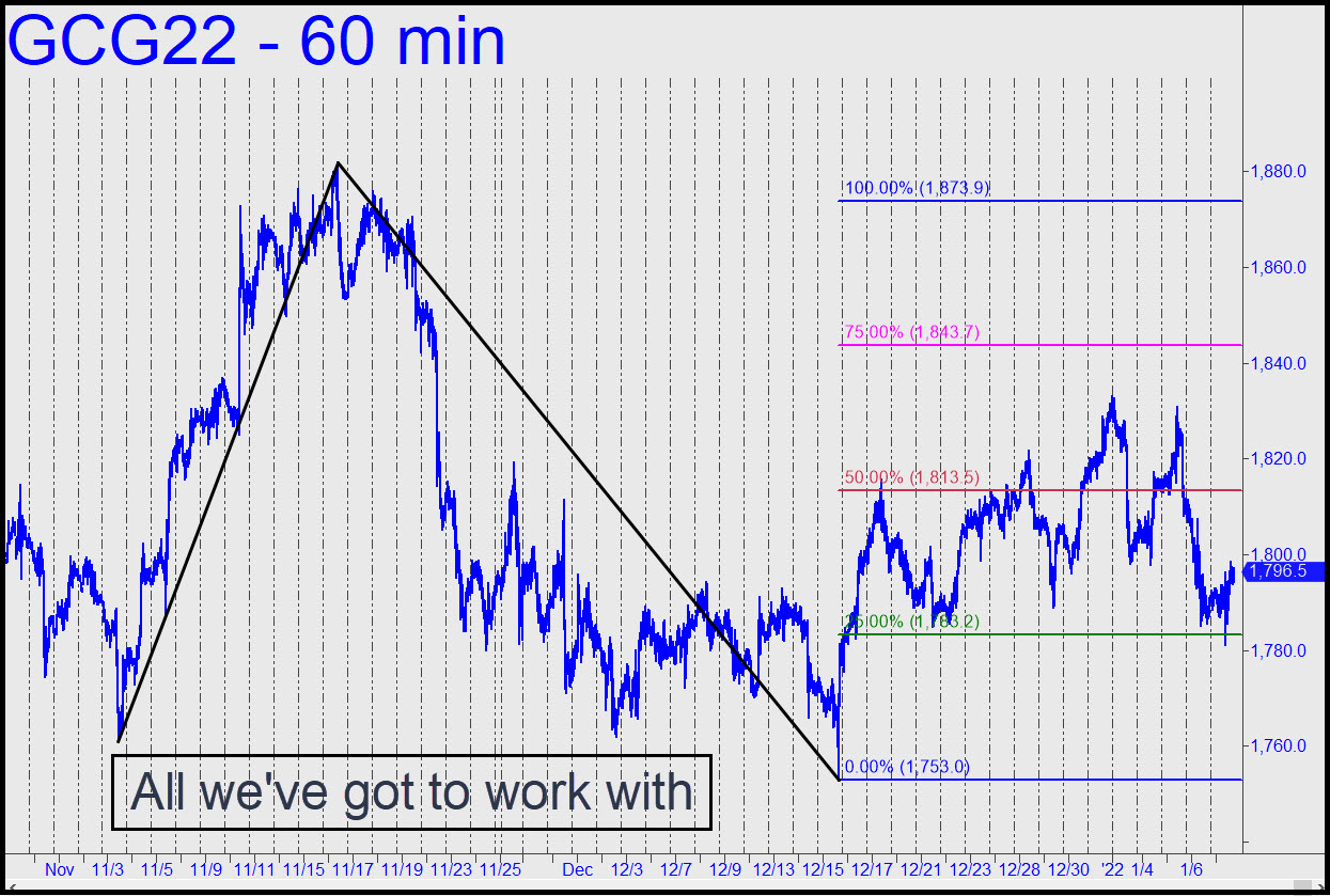 The ‘reverse’ pattern shown triggered a ‘mechanical’ buy on Friday slightly above the green line I’d flagged at 1783.20. A subscriber who reported doing the trade didn’t say how, but I’ll assume a tight ‘camo’ set-up was used that might have triggered as low as 1783.90 (for instance: 60-minute, reverse a= 1785.40 on 1/6 at 9 a.m.). I’ll recommend exiting half the position on the opening Sunday night, since gold’s rallies have been balky and short-lived. Thereupon, implement a trailing stop that would put half of any profits booked up to that point at risk. A third contract should be offered $10 higher, but check back, since that could change depending on how this vehicle opens on Sunday. ______ UPDATE (Jan 10, 7:13 a.m.): Exiting two contracts at 1796.40, Sunday evening’s opening price, leaves two contracts (or 50% of the original position) with an effective cost basis of 1770.00. Offer half of what remains at 1813.30, just below the pattern’s midpoint Hidden Pivot, with an o-c-o order stopping out the entire position at 1785.60. (This is an ‘impulsive’ stop on the 30-minute chart that references two very recent, external lows.) _______ UPDATE (Jan 11, 8:55 p.m.): If you followed my instructions, you’re sitting on realized gains of $4,300 and are still long a single contract (or 25% of the original position) with an unrealized gain of $5,000. Use an 1801.00 stop-loss for now, O-C-O with an order to exit the remainder of the position at 1839. A ‘dynamic’ trailing stop can be substituted above 1828. ______ UPDATE (Jan 12, 5:23 p.m.): The dynamic stop suggested above triggered at 1825.40 after the futures topped at 1828.20. The total profit on the position would have been around $8000. Do nothing further for now.