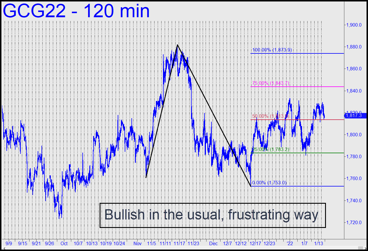 The week ended with a very real profit of as much as $8,000 for anyone who followed my explicit instructions. Can we do it again, you ask? Probably, although trading this particular vehicle successfully will always be akin to extracting opportunity from a hacking cough. Our winners areĀ necessarily leveraged at the tops of disappointing rallies and at the bottoms of gratuitously scary dives. That, after all, is what gold does — has been doing for years. Between these extremities lies the aforementionedĀ hacking cough, and although its volatility should make for bountiful trading in theory, it is too much work to concern ourselves with here. The pattern shown has rewarded ‘mechanical’ buyers twice, but I doubt a third winner will be so easy. Even so, you can use the ‘reverse’ pattern shown, with an 1873.90 rally target, to plot your strategy or merely assess the strength of the uptrend, such as it is. The bad guys seemingly lack the guts to push the futures below C=1753.00, but I hesitate to use this observation to greenlight any old ‘mechanical’ buy set-up that comes along. ______ UPDATE (Jan 19, 10:40 p.m. EST): This evening’s vertical spike has stalled very precisely at p2=1843.70 of the bullish pattern that has guided us for the last month. A decisive push through it would clinch more upside to the 1873.90 target, but it will be more interesting if this Hidden Pivot gives way easily. That would set up a test of the key ‘external’ peak at 1922.80 recorded on June 1.