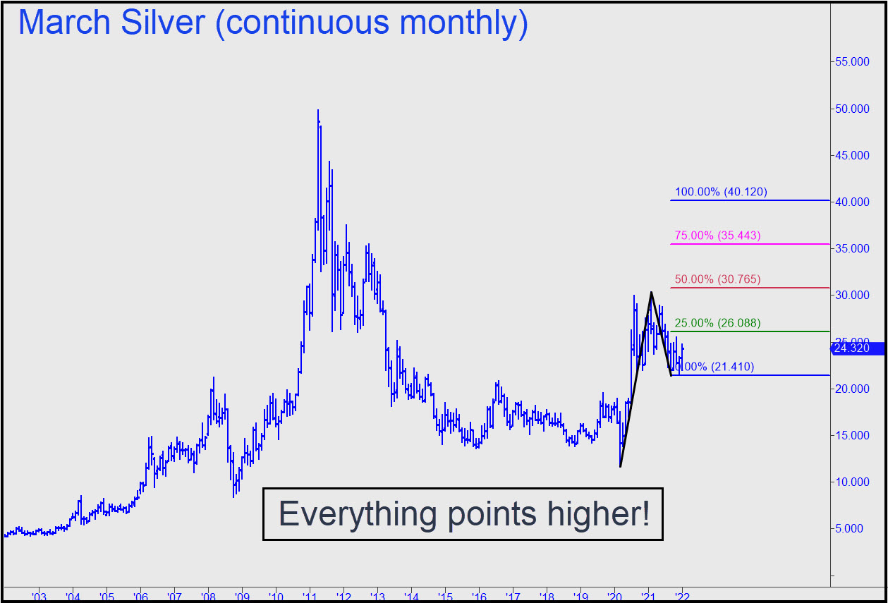Silver demolished an important Hidden Pivot resistance at 24.01 with such force on Friday that we shouldn’t hesitate to consider far more ambitious targets. The one shown at 40.12 is not even the most optimistic on the horizon; that lies at 53.06, the target of a pattern begun from 8.77 more than 13 years ago. We’ll be better able to judge the power behind the move when we’ve seen how it interacts with the smaller ABCD’s 30.76 midpoint pivot. Another lies at 32.35, and it is likely to be even more challenging, since it is the midpoint pivot of the much larger pattern. The lower midpoint is not in play yet, since it will require a rally to the green line (x=26.09) to lock in the recent low at 21.41 as the pattern’s point ‘C’; however, the big pattern has already done so. In any event, and as you can see, both patterns have very steep impulse legs pushing the rally. That is coiled power, and if it is unfelt now, it eventually will be. It also portends bullish ‘mechanical’ set-ups throughout the bull market that are extremely likely to work. Stay tuned! ______ UPDATE (Jan 24, 8:40 p.m.): My extravagant rally targets (see above) tapped a gusher of bullish sentiment in the chat room today. That’s all well and good, but please keep in mind that the March contract will need to get past November’s 24.58 peak and then some before we break out the bubbly. Last week’s exuberant, Hidden-Pivot-demolishing spike was a welcome and encouraging step in that direction, but no more. ______ UPDATE (Jan 26, 9:27 p.m.): The futures will fall to at least D=23.01 if the secondary support a 23.27 fails. Bottom-fish there only if you know what you’re doing. _______ UPDATE (Jan 27, 8:57 p.m.): Today’s downdraft did significant technical damage, since it exceeded no fewer than three prior lows, two of them external. A drop to D=22.01 looks imminent, but let’s see what develops over the next couple of days to be sure.