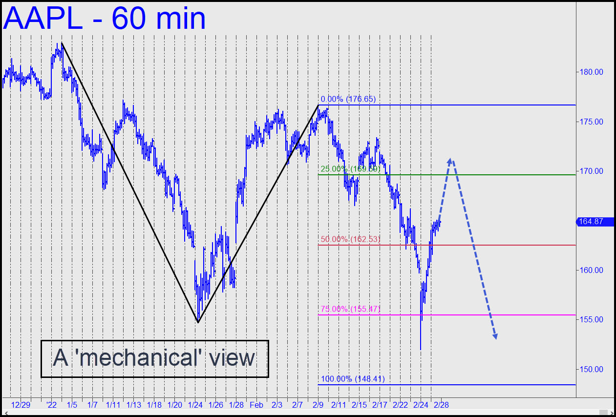 If the rally hits the green line (x=169.59), it would set up a textbook ‘mechanical’ short, even though the trade might not feel so appealing at the time. It would come with the stock in the throes of a ballistic ascent fueled by increasingly panicky short-covering. Still, the success rate of ‘mechanical’ shorts at the green line following a dip into the void between p and p2 has been nothing short of remarkable — perhaps 80% or more. Success in this context means the short once initiated would deliver a gain of at least one full Hidden pivot level. With initial risk of about $2800 on four round lots, I’ll suggest using a ‘camouflage’ set-up to trigger the trade. For real-time guidance, tune in to the chat room if and when the stock gets within 1.00 point of the target. ______ UPDATE (Mar 1, 11:40 p.m. EST): If AAPL rallies to the green line, a short there has become less appealing because the stock will have done so following a three-day consolidation above the red line. The trade would still be do-able, but only if you can whittle down risk to a practical minimum with a ‘camouflage’ trigger. Stay tuned to the chat room and to ‘Notifications’ if you seek more-nuanced guidance in real time.