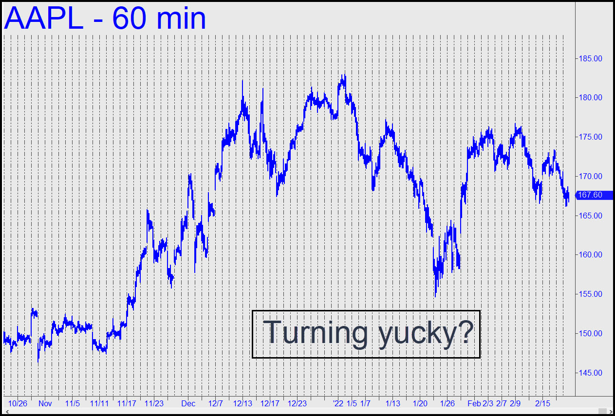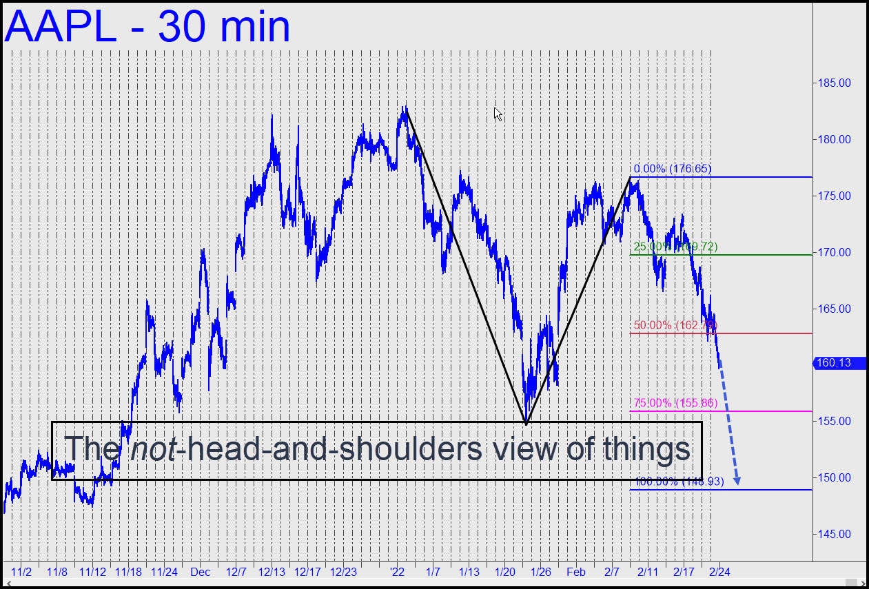 Perhaps the new week will bring more clarity to a graphical picture of AAPL that is beginning to turn a little murky? The only thing keeping me somewhat bullish at the moment is the incipient reverse-head-and-shoulders shown in the chart. It is a seven-month fetus at this point, however, and only further gestation will reveal how well-formed and healthy the baby is likely to be. A big move down would probably render the pattern stillborn, but it would only benefit bullishly from a big rally. _______ UPDATE (Feb 23, 5:17 p.m.): The playful little jig that AAPL just did on its midpoint-pivot gravesite suggests it is on its way down to exactly 148.93, the ‘D’ target of the pattern shown here. First, let’s root for a punitive fall to at least p2=155.86. _______ UPDATE (Feb 24, 11:28 p.m.): AAPL’s canny handlers impaled shorts with a spectacular bear rally. Like the bounce in the E-Mini S&Ps, this one began about midway between p2 and D, a ‘discomfort zone’ spot too tricky too rely on. The bounce occurred from where it did because nearly every trader on earth was waiting to buy at the D target of an all-too-obvious pattern.