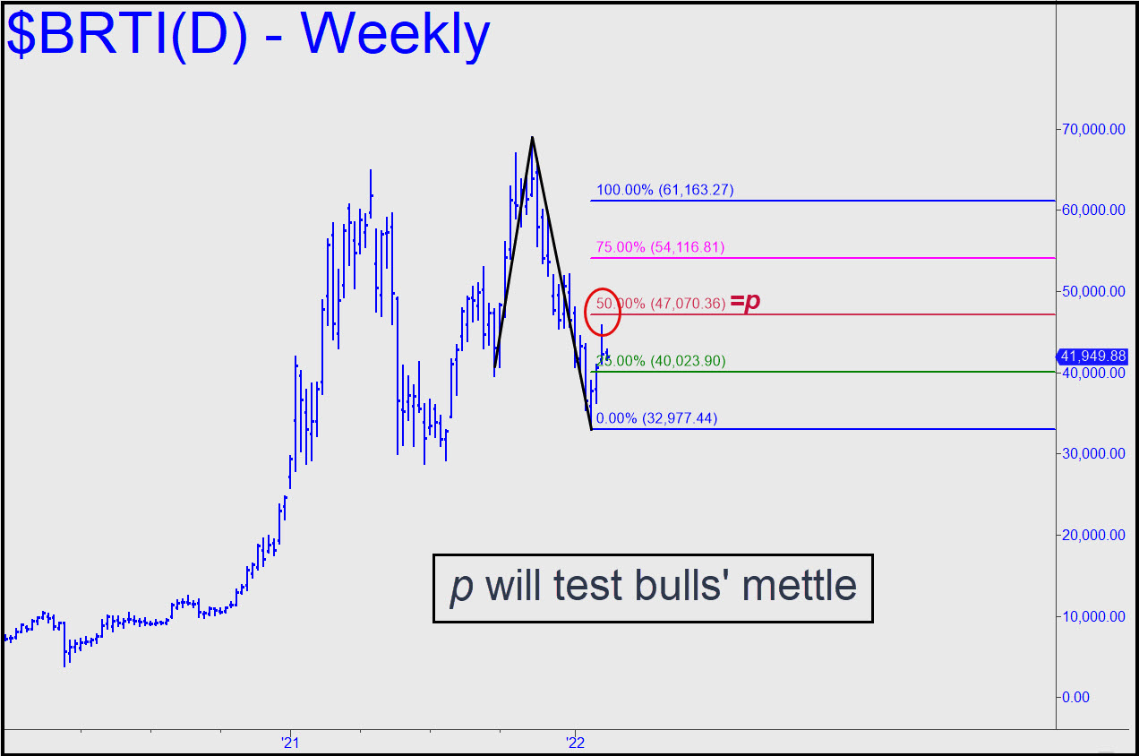 Bertie has displayed little of its former market-leading brio lately, but it is nonetheless in a robustly impulsive uptrend that projects to as high as 51,556 over the near term. That target is speculative at this point, since the calculation uses a low at 42,011 on Friday that may not endure. A bigger picture using a ‘reverse’ pattern dating back to October offers the prospect of a run-up to as high as D=61,163, but we’ll need to see how bulls fare at p=47,070 before we can confidently assess the strength of the uptrend.