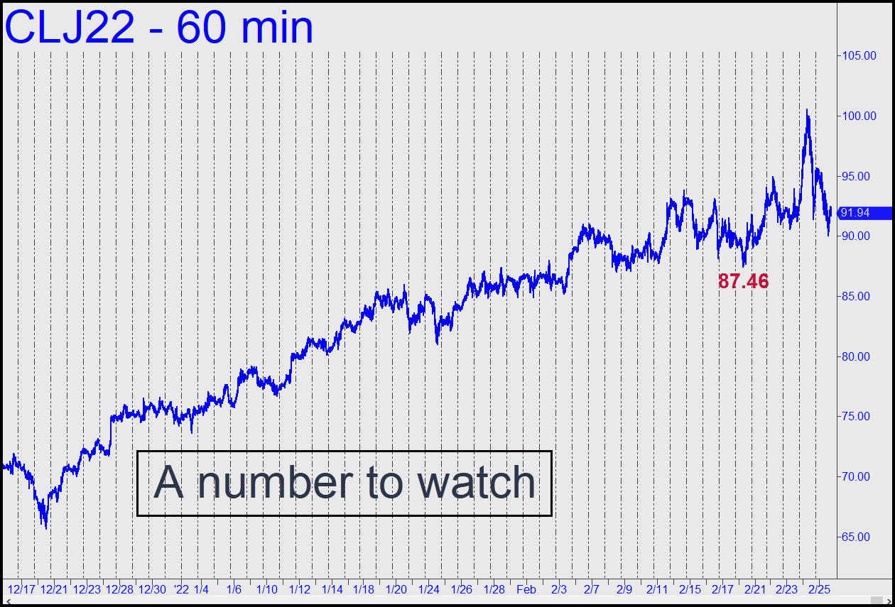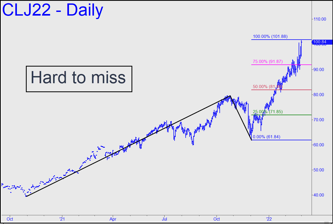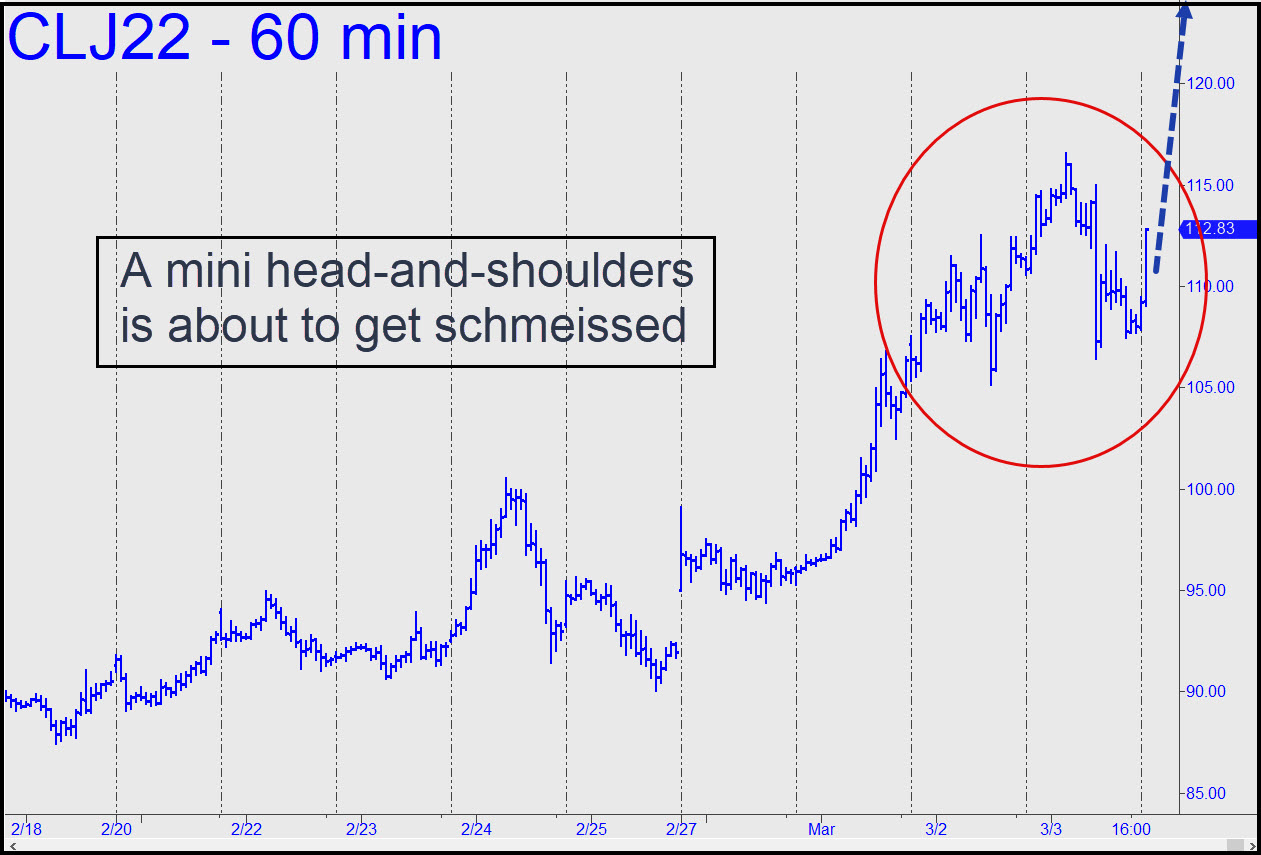 The sharp reversal from $100 last week was so predictable that it’s hard to take it seriously. Everyone has known that $100 is a psychologically crucial price, implying there is absolutely no way it will cap crude’s world-shaking ascent. Enjoy the correction while it lasts, since the new highs that are eventually coming will push gas prices above $6 in California and other places where fuel pretends to be scarce. The 107.63 target given here earlier still obtains, and only a drop below the 87.46 ‘external’ low recorded on 2/18 would hint that it is not necessarily a done deal. _______ UPDATE (Mar 1, 9:10 a.m. EST): I can’t account for having overlooked the very major, 101.88 rally target shown in this chart, but here it is. A place for caution, to be sure, and to squeeze off a tightly stopped short if you know how. ______ UPDATE (Mar 2, 12:17 a.m.): Shorts will have gotten their faces ripped off by today’s spectacular bear squeeze, but their pain is the least of civilization’s worries. When energy used to power nearly everything on the planet is repriced to take today’s massive surge into account, it will turn that which lubricates global economic movement into something like glue. Under the circumstances, the Dow showed chutzpah to have fallen a mere 500 points. Consider it an odd kind of distribution –the best the sleazeballs who manipulate markets professionally could do. But don’t expect the relative softness in selling to last much longer once investors get the message. The same bozos have also underreacted to the breathtaking rally in T-Bonds, but it, too, is about to overtake them with dread. _______ UPDATE (Mar 2, 8:44 a.m.): Speaking of bozos, here’s a chart I prepared last night that, if I’d remembered to include it with the update, would have told you in timely fashion precisely where April Crude was going — i.e., to at least 113.99. _______ UPDATE (Mar 2, 7:53 p.m.): The midsession dip to the green line (x=105.37) shown in the last chart update signaled a trade that has been the most consistent winner in our bag of Hidden Pivot tricks. It was good for a gain of $11,520, or as much as $23,000 if you held out for p2=111.12. D=113.99 remains viable and looks all but certain to be reached. _______ UPDATE (Mar 3, 7:56 p.m.): The April contract has met all of our immediate rally objectives and then some, capping the effort with what looks like a small, bearish head-and-shoulders pattern. Although nothing serious, resistance from the pattern should be enough to put the kibosh on crude’s runaway rally for at least a few days. So why, then, are the futures on a holy tear this evening, threatening to blow past the intraday peak for a shot at$120 ahead of the weekend? The energy-using world will have to deal with soaring energy prices in one way or another, but we shouldn’t expect the scoundrels and child molesters who move the markets to remain inured to this grave economic threat for much longer. If oil quotes keep rising, the Dow will need to start adjusting its way down to 20,000, and soon.