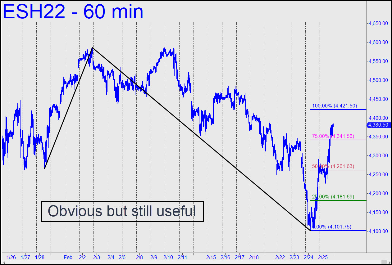 Friday’s unrelenting short-squeeze appeared headed to the 4421.50 target of the reverse pattern shown (inset). The run-up from Thursday’s low has yielded no interesting buying opportunities, since the pullbacks have been too shallow to bring the futures within the range of a ‘mechanical’ bid at either p or x. Impulse legs on the hourly chart have not been stellar, however, implying the rally is probably not destined for greatness. Regardless, if the move pops through ‘D’ with sufficient force, that would increase the likelihood that new record highs are coming. Bears had been slogging painfully lower for nearly three weeks, gaining by inches, but on Friday they were no match for short-covering that seemed hell-bent on stealing it all back in mere days. ______ UPDATE (Mar 1, 11:50 p.m.): It’s not exactly a sign of good health that the March futures have struggled for three days to achieve an easy rally target. Even so, we won’t count out the chimps charged with keeping this hoax alive and with making life as difficult as possible for those who would seek to profitĀ from a suspected bear market. Let’s move to the sidelines for now.