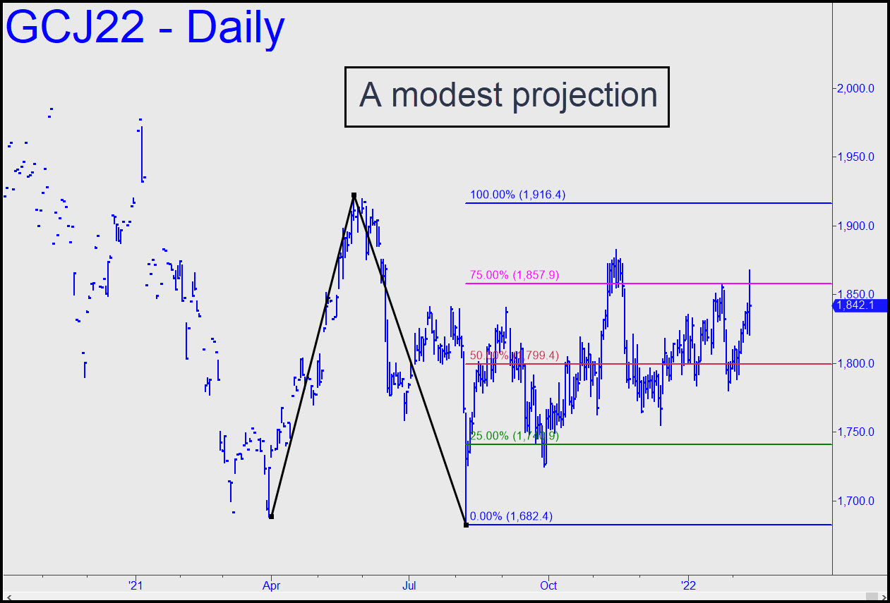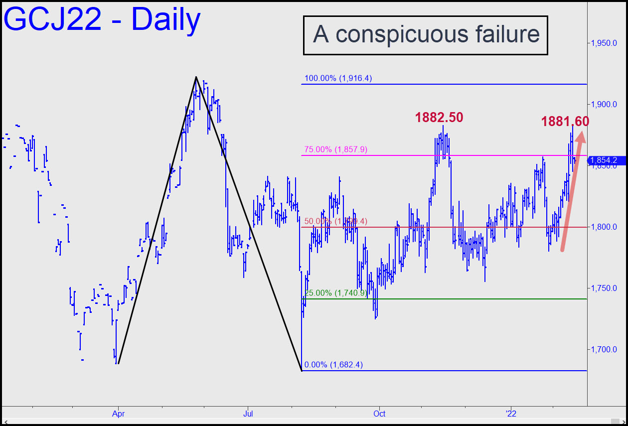 The 1875.10 rally target of a ‘reverse’ pattern tracing back to November remains my minimum upside projection for the near term. The pattern has produced stellar ‘mechanical’ gains for subscribers who used it to get long on the dip to the green line back in October. Looking ahead optimistically, I’ll suggest using the new, larger ‘reverse’ pattern shown to stay with the trend no matter how erratic it becomes. The pattern paradoxically yields a more modest target at 1916.40 than some smaller ones I could have used. However, because this is gold, which so often disappoints, I am being cautious. As always, a decisive move through this Hidden Pivot resistance on first contact would be a welcome sign that the rally has farther to go — perhaps much farther. We shall see. _______ UPDATE (Feb 15, 11:23 p.m.): The rally’s failure by $1 to surpass key peak at 1882.50 recorded in November warrants a cautious outlook. Even if the peak eventually is exceeded, the likelihood of significant upside from there has already decreased. _____ UPDATE (Feb 17, 6:15 p.m.): The futures appear all but certain to achieve the 1916.40 target, which served to keep us confidently on the right side of a balky trend. Let’s see how bulls handle this ‘hidden’ resistance, since an easy move past it would portend a continuation of the uptrend. You can short there with ‘camouflage’ if you’ve made some bucks on the way up.
