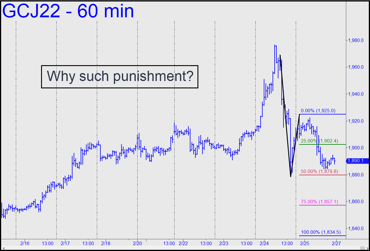 Bulls might be wondering what they did to deserve such brutal punishment. Why can’t gold, which is in a bull market, rise relentlessly like the FAANG stocks have been doing for years? The answer is that gold’s bull market is in its adolescence rather than in a hyper-extended blow-off. If it’s any consolation, the two day plunge that ended the week failed to wipe out even half of February’s strong gains. The correction probably has at least another day or two to run, but I’d suggest using the pattern shown to get a handle on it as the new week begins. You should have noticed that the futures stopped a split-hair shy of a key resistance I’d flagged at 1977.10, demonstrating yet again their propensity to turn at price points so stupidly obvious that experienced traders are scared out of believing they will work. The best way for us to leverage this kind of group-think is to focus on ‘counterintuitive’ set-ups in particular, since they harness our own fears to make hay with contrarian ideas. _______ UPDATE (Feb 28, 9:08 a.m.): Here’s the same pattern, but with ‘C’ adjusted higher. Unless the new ‘C’ at 1935.20 is exceeded, the pattern should still work well for trading and analytical purposes.