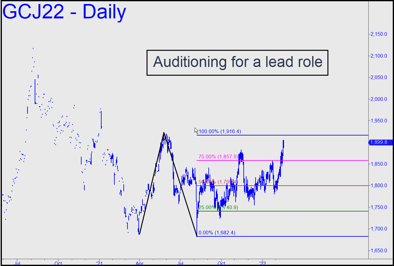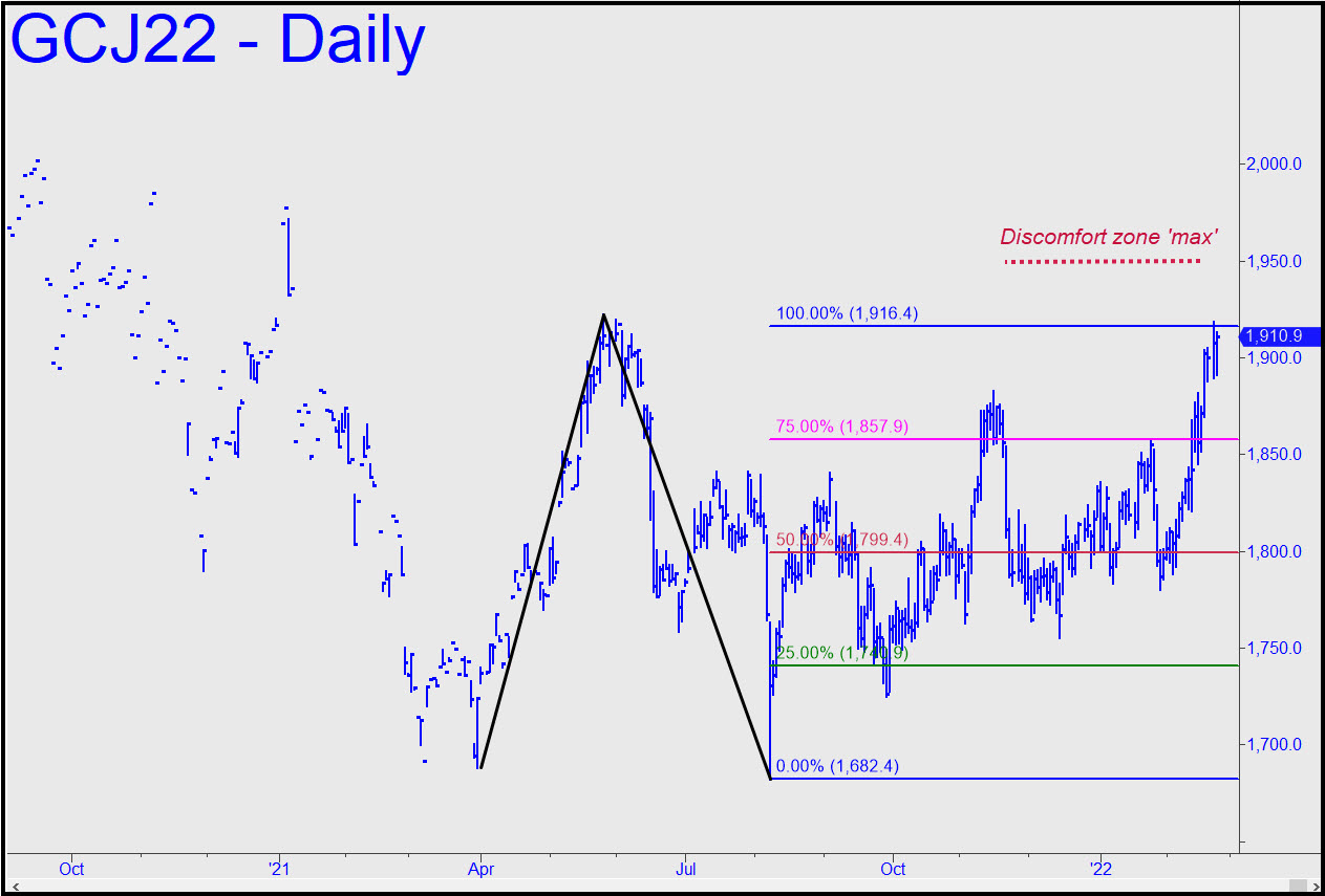 The April contract is closing on a 1916.40 rally target that has been coming since August, albeit not without far more sturm und drang than gold bugs might have preferred. This is a bull market patiently waiting for a change in the very big picture to make its move. Although the nature of the change is impossible to predict, we can surmise that it will be concurrent with a fraught morning on which portfolio managers awaken with the kind of dread they haven’t felt since 2008. In the meantime, we’ll closely monitor price action when ‘D’ is hit, since an easy move past it would imply that bullion may at long last be heating up. ______ UPDATE (Feb 23, 5:30 p.m.); The so-far shallow correction after the futures kissed the 1916.40 target earlier this week suggests they’re fixing to go higher. If so, look for the move to be effortless until around 1950, where ‘discomfort zone’ jeopardy will be at maximum force. It’s a scalp-short for those who know how, but that wouldn’t diminish the likelihood of a subsequent run-up to 1977.60, where the April contract made an important peak early this year. Here’s a fresh chart. _______UPDATE (Feb 24, 9:52 a.m.): Oh my, such a shocking surprise! April Gold ran up to within a split hair of the 1977.60 resistance noted above, then sold off by a whopping $40. We will be in wait-and-see mode for a while, with high-confidence trade set-ups possible only on the lesser charts.