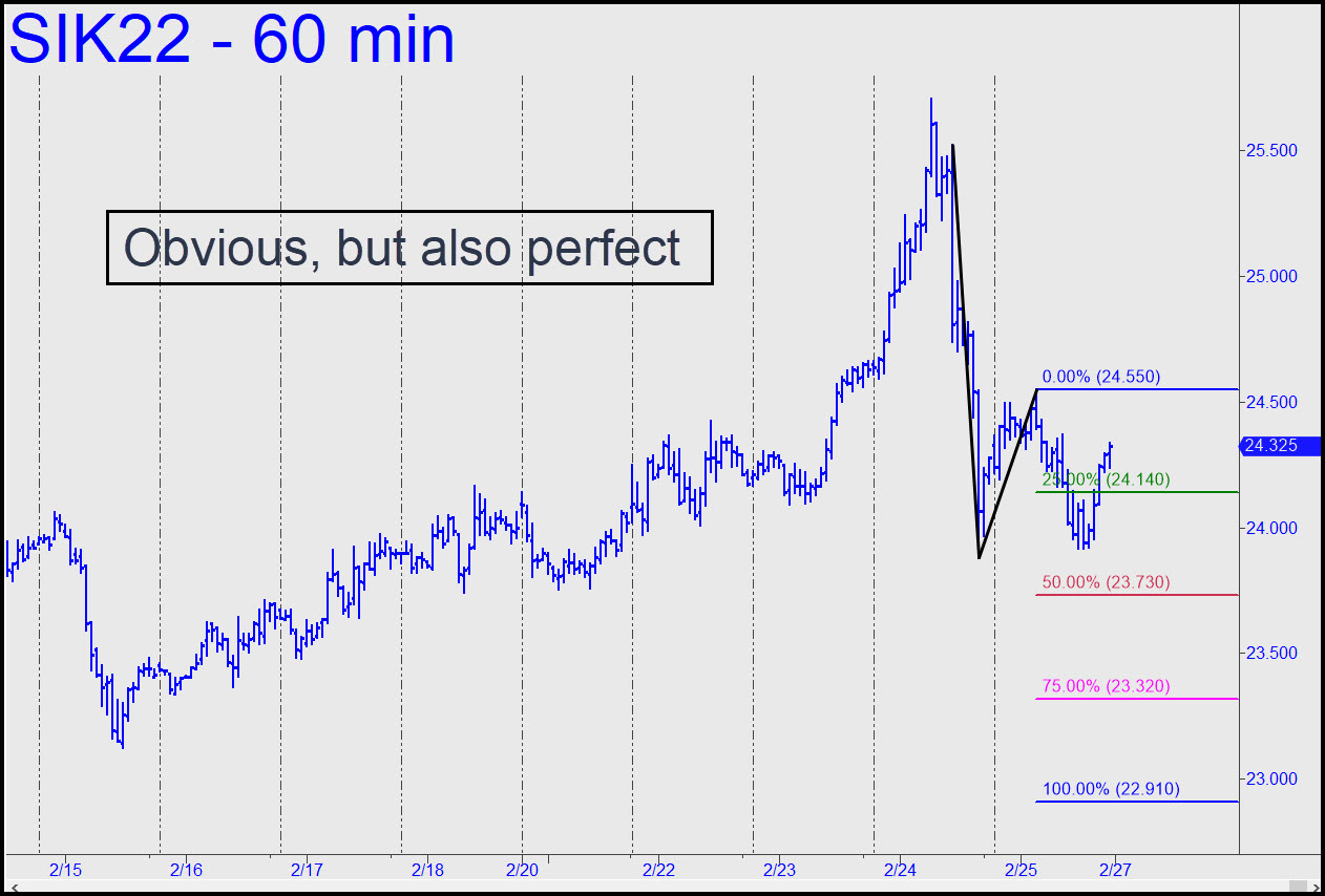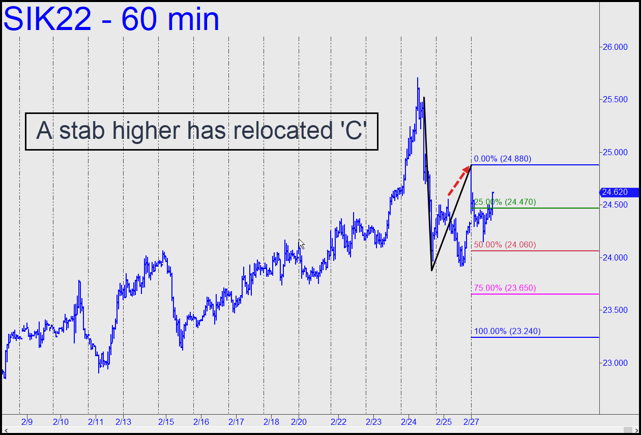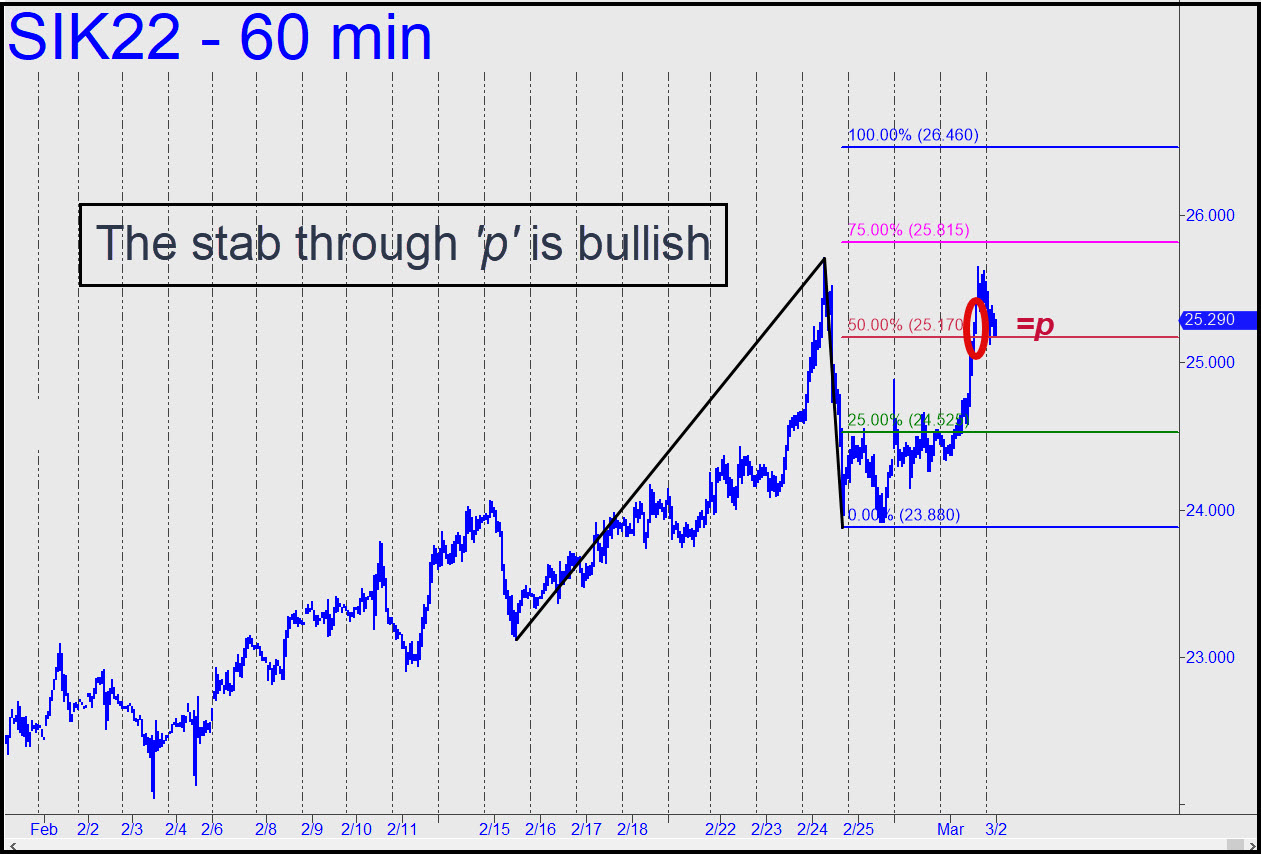 The corrective pattern shown may look too obvious to work well for trading purposes, but it nonetheless has technical perfection going for it: a perky little one-off ‘A’ high, three single-bar coordinates, and Hidden Pivot levels located smack dab in the Nowheresville of other traders’ charts. That implies it will likely work for ‘mechanical’ shorts, timely trend-strength assessments and precisely located bids against the trend. Most immediately, we will be looking for more slippage to p=23.73, at least. Our trek through the woods over the next week promises to be easy and rewarding, so stay tuned to the chat room if silver is your bag. _______ UPDATE (Feb 28, 9:02 a.m.): Here’s the new pattern generated by this morning’s bull-trap stab higher. It too should work nicely for all purposes. _______ UPDATE (Mar 1, 11:59 p.m.): The decisive move through p on first contact implies the odds of a continuation to at least 26.46 are very good. A pullback to x=25.52 would trigger an appealing ‘mechanical’ buy, but I’d suggest doing so with a ‘camo’ set-up, since the implied entry risk on four contracts would be around $33,000. Nudge me in the chat room at the appropriate time and I’ll be happy to provide more-detailed guidance. [Here’s the chart, which I prepared last night but somehow neglected to include.]