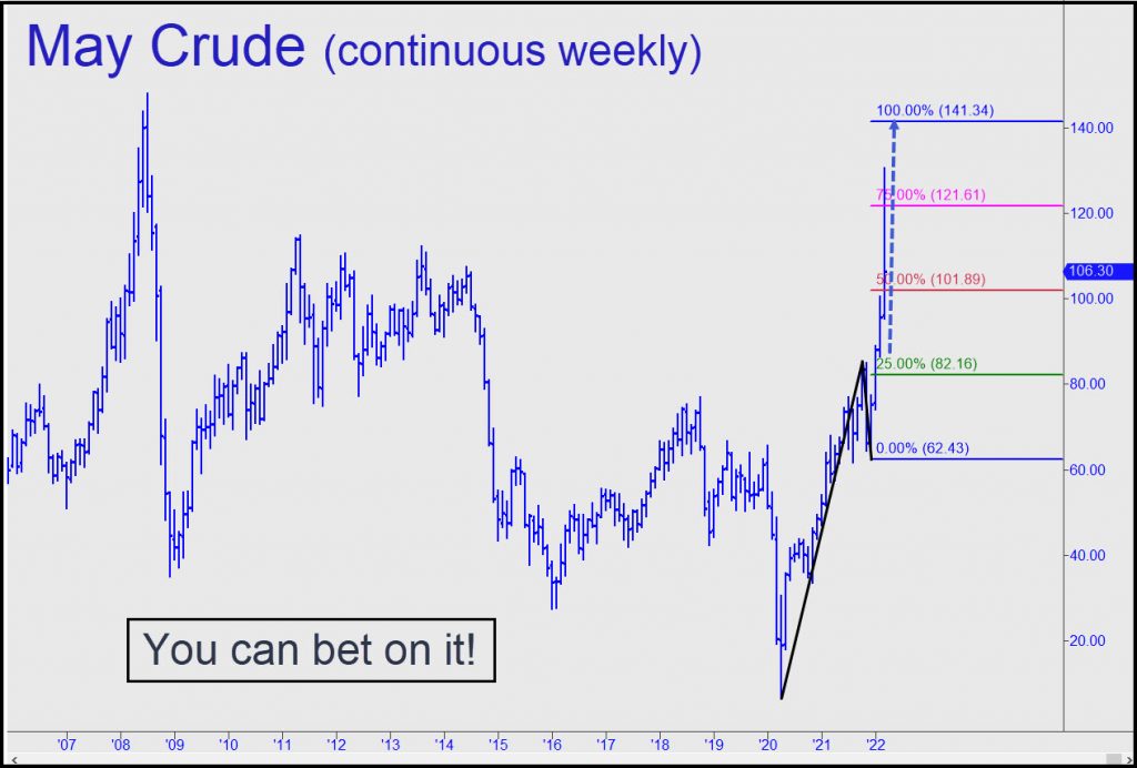 So where might crude’s rally reverse, popping an asset bubble that has been building for more more than three decades? The chart above makes a persuasive case for a bull-market top at $141. That would represent an 8% gain over this month’s so-far peak at 130.50, and a 33% gain over the current $106. The May contract shown may need to correct for a few weeks or longer before the blow-off rally can begin, but there can be little doubt that it will reach a minimum 141. Under the rules of the Hidden Pivot Method, this can be inferred from the ease with which buyers blew past the red line, a ‘midpoint resistance’ at 101 that is often useful, if not to say infallible, in determining trend strength. The chart also suggests that a pullback to the green line ($82) would offer an extraordinary opportunity for bulls to get aboard ‘mechanically’ for one last, spectacular ride.