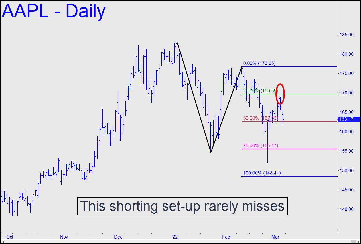 The stock narrowly missed triggering a ‘mechanical’ short last week when it rallied to within an inch of the green line (x) on Thursday. For analytical purposes, however, we’ll treat the trade as having filled, since that will preserve a useful pattern for gauging the strength of the downtrend if AAPL should continue to fall as I expect. The Whoopee Cushion bounce off the Feb 24 low at 152.00 appears to have sputtered out, but if buyers get second wind and push up to the green line again (x=169.59), it can be shorted with a stop-loss at 176.65. (We can cut the risk by 95% with ‘camouflage’, so stay tuned to the chat room if the trade interests you.) Meanwhile, look for more slippage to at least 155.47, the secondary pivot. ______ UPDATE (Mar 7, 8:04 p.m.): Time for me to mention D=148.41, the downside target shown in the chart. A rally to the green line (x=169.59) would still make an enticing ‘mechanical’ short, but we may not be so lucky.