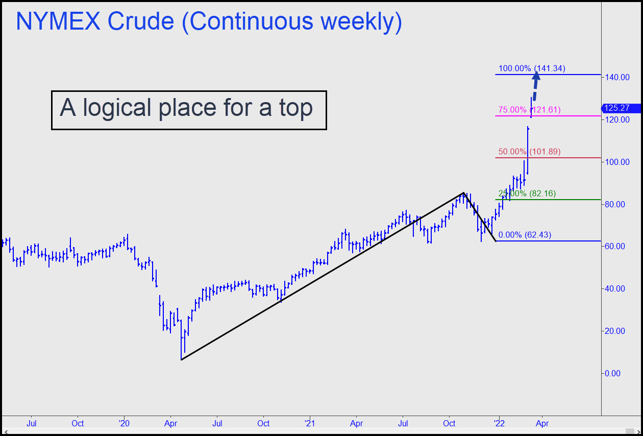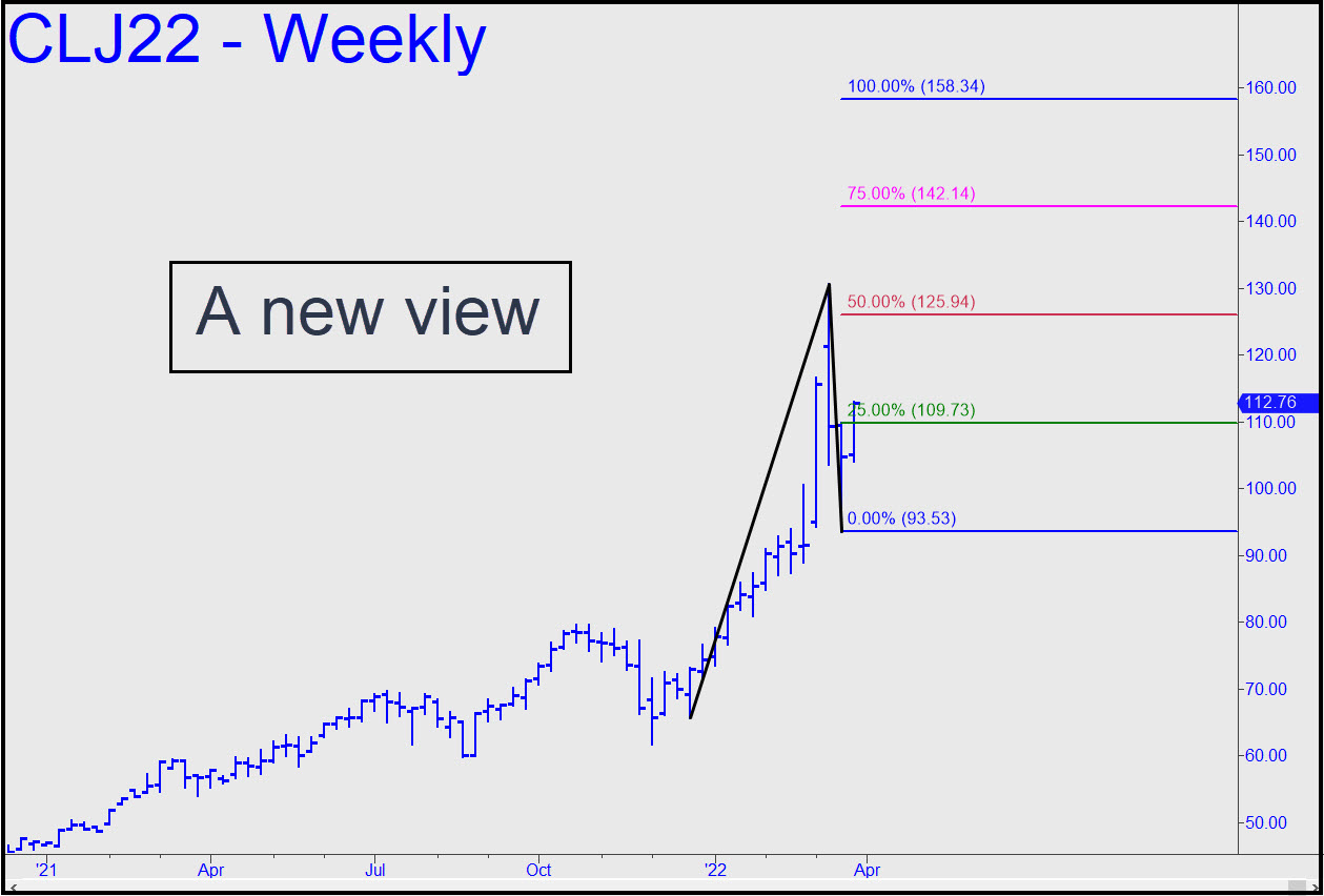 April Crude’s ascent seems all but certain to continue to at least 117.82, the target shown in the chart, but if this Hidden Pivot resistance fails to slow down buyers, look for a further rally to at least 122.30, the target of a larger pattern (A= 95.29 on 2/28). Chat-room interest in this vehicle has been low, but if I see an exceptional ‘camouflage’ or ‘mechanical’ buying opportunity developing intraday, I will nonetheless signal it and send out an email ‘Notification’. This is a new Rick’s Picks service that has produced some winners for subscribers who are not able to monitor the chat room closely. ______ UPDATE (Mar 6, 10:09 p.m. EST): The odd but entirely legitimate pattern shown maxes out immediate rally possibilities for April Crude with a 141.34 target. Judging from the way buyers crushed the midpoint resistance, the target is all but certain to be achieved eventually. A short there looks promising, but I am suggesting this only to those of you who have made money on the way up or who know how to cut entry risk to relative pocket change with a ‘camo’ trade set-up. The 141.34 objective is not guaranteed to be precisely accurate, since the coordinates are based on a composite chart. ______ UPDATE Mar 22 7:08 p.m.): This chart shows that today’s short squeeze tripped a theoretical buy signal at x=109.73 for a possible shot at 158.34. The 125.94 midpoint pivot can serve as a minimum upside projection for now, however. The pattern is radically different from the one proffered initially, a blended contract with a 141.34 destination. I have not offered a fresh tout with the new chart because WordPress would have put it at the top of the touts list. If subscriber interest in crude revives, though, I will step up coverage.