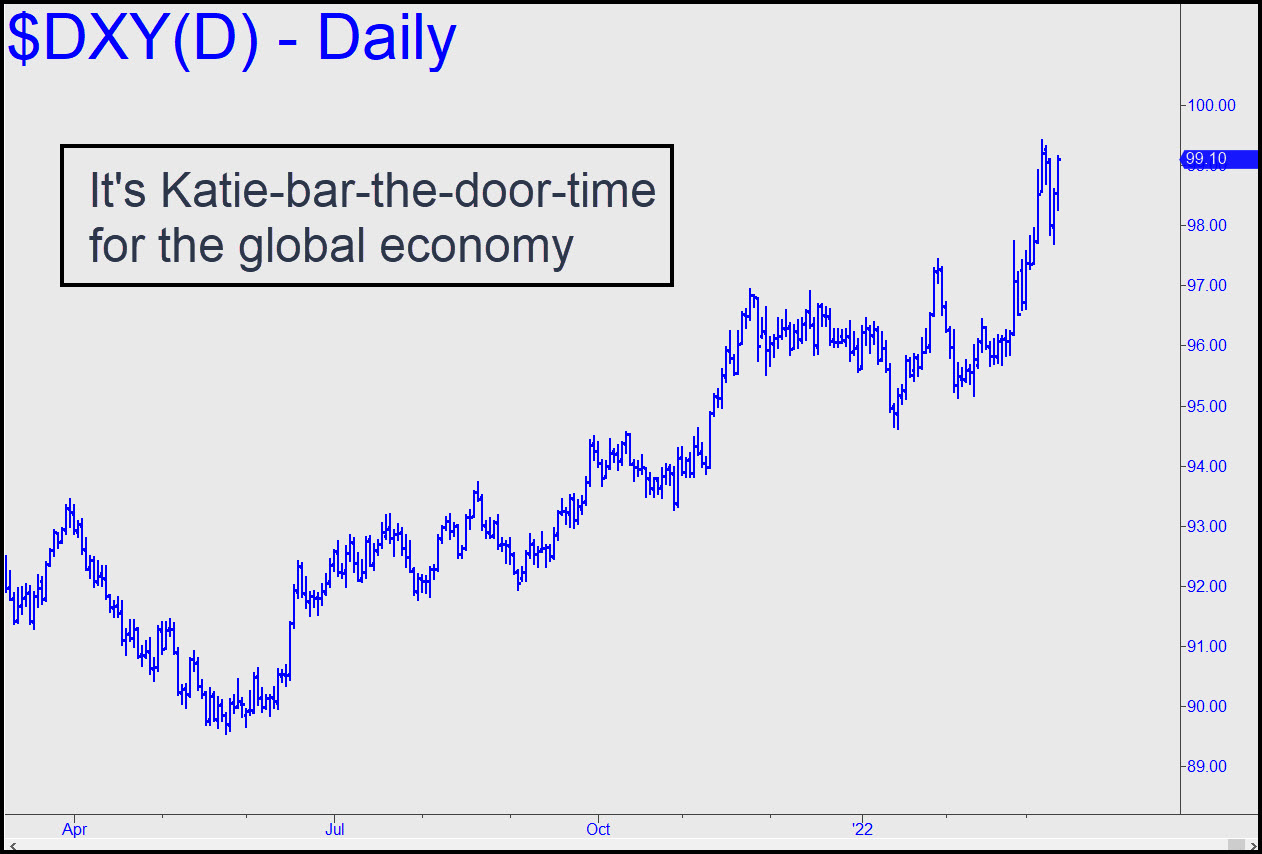 I’ve been shouting about this for many years, but let me repeat it once again: The last thing the world needs is a strong dollar, since it will lead inexorably toward ruinous deflation. Over several decades, I’ve never wavered in my hyper-bullish outlook for the dollar, even amidst current headlines screaming about inflation, and regardless of what most economists were saying. That’s because I see no resolution for the global debt bubble other than via massive liquidations that would be tantamount to deflation. A stock market bear will be the catalyst, assuming some ‘black-swan’ asteroid does not hit us first. From a technical standpoint, the dollar index is rallying sharply after the briefest of corrections. That is quite bullish, but even moreso because the recent 99.42 peak whence the correction began had hugely overshot its Hidden Pivot rally target. _______ UPDATE (Apr 7, 12:09 p.m.): This chart, too, should have been included earlier, since it shows a can’t-miss minimum rally target at 103.25. It is predicated on an easy move past p2=99.74, but I doubt that will be a problem. ______ UPDATE Apr 13, 11:012 p.m.): Here’s a pattern I somehow overlooked that shows why DXY topped exactly where it did. The weakness presumably is corrective, since we have the outstanding target at 103.25 noted above..