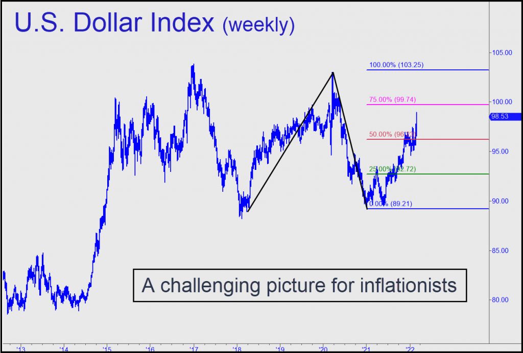 Most economists will tell you that that would be highly inflationary. Indeed, the rise so far accounts statistically for much of the current inflation. However, at some level, perhaps even the current one of around $115, demand will begin to dry up, since consumers more and more will lack the means to pay for endless surcharges in the price of goods and services requiring energy inputs. There is a double-whammy here, too, since energy resources are the collateral backing much of the world’s sovereign debt. Imagine how quickly inflation could turn to deflation when the oil-price blowoff ends, as it must. When that happens, everyone on the lending side of each and every derivatives transaction should just kiss his money good-bye. Unfortunately for us all, this is not just imaginable, it is inevitable, since it will be an unavoidable effect of the coming bear market in U.S stocks.