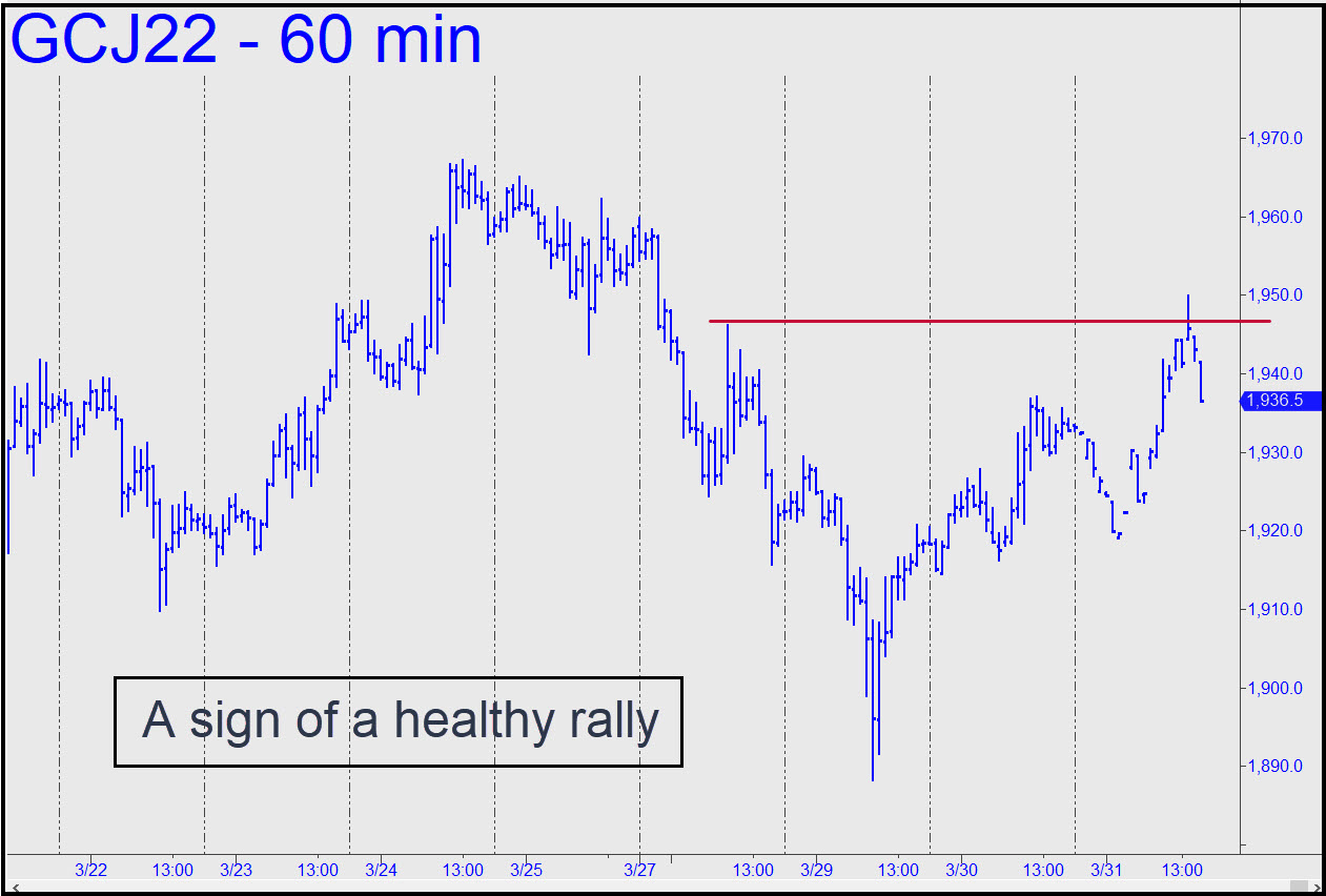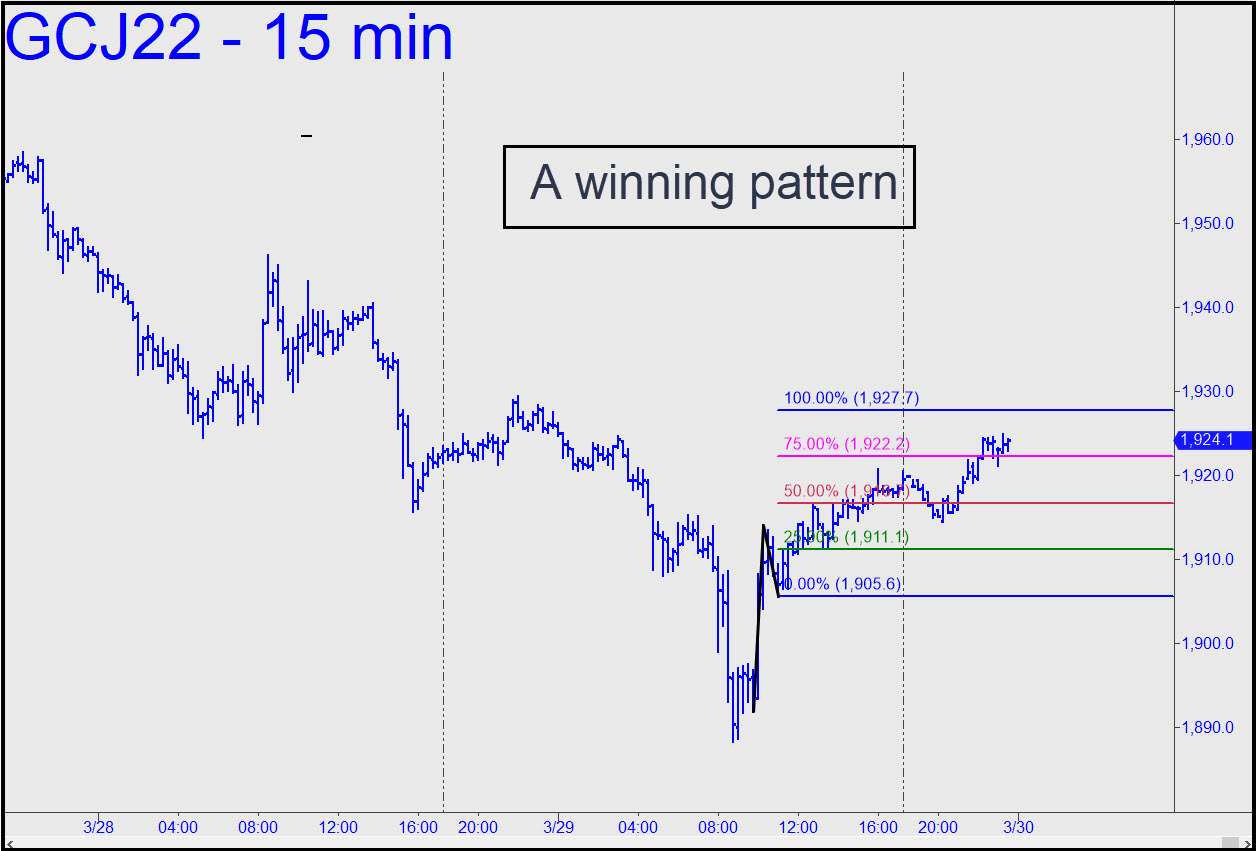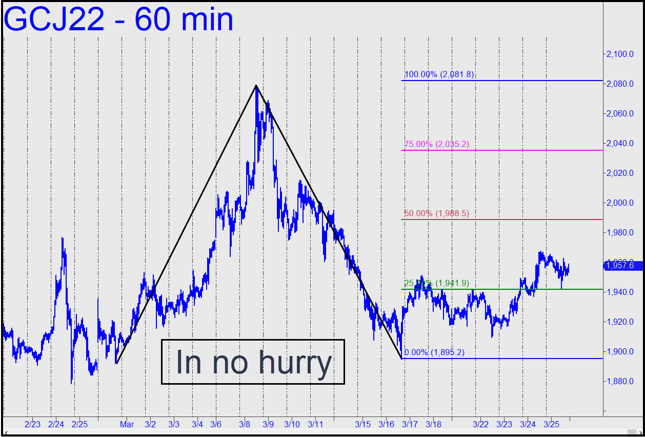 Gold has rewarded patient bulls with an occasional kick in the teeth and an uptrend that can suddenly turn into a Bataan march for months on end. The good news is that it has done even worse by bears, demonstrating repeatedly that, try as they may, they cannot suppress strong, persistent demand from all corners of the world in these all-too-interesting times. At present, the April contract is making its way toward a seemingly inevitable rendezvous with the 1988.50 midpoint Hidden Pivot shown in the chart. We’ll know whether buyers are capable of hitting D=2081.80 once we’ve seen how they fare on first contact with the midpoint resistance. Trade with a bullish bias for now, but only with risk tightly controlled using entry set-ups on the lesser charts (a.k.a. ‘camouflage’). ______ UPDATE (Mar 28, 5:22 p.m.): The rally turned to crud well shy of 1988.50 (see above), so the yellow flag is out. My hunch is that the usual scumwads from the bullion banking world will stop out C=1895.20 before they cease their gratuitous pounding of gold. _______ UPDATE (Mar 29, 11:30 p.m.): Although the rally came from a ‘too-obvious’ place, it evidently caught enough traders by surprise to keep on going. This pattern, which produced a ‘mechanical’ winner on the pullback to the green line, can tell us if the uptrend will continue if D=1927.70 is decisively breached. It will also work for for an rABC short, using an extremely tight a-b segment. _______ UPDATE (Mar 30, 10:09); Yo-te-ho! The futures rallied overnight, topping at exactly 1927.80 (2:25 a.m.), a single tick above the Hidden Pivot target I’d furnished for your trading guidance; then they relapsed to 1916.30 over the next three hours. A short with as tight a stop-loss as two ticks would have survived, and the trade could have produced a profit of as much as $4600 on four contracts. The rally has since revived and blown past D=1927.80, implying bulls are still very much in charge. ______ UPDATE (Mar 31, 6:35 p.m.): The futures sold off into the close, but not before exceeding an important ‘external’ peak at 1946.10 recorded on Sunday night. This is bullish and implies gold should be bought on weakness. Here’s the chart. I will be switching to the June contract on Sunday.