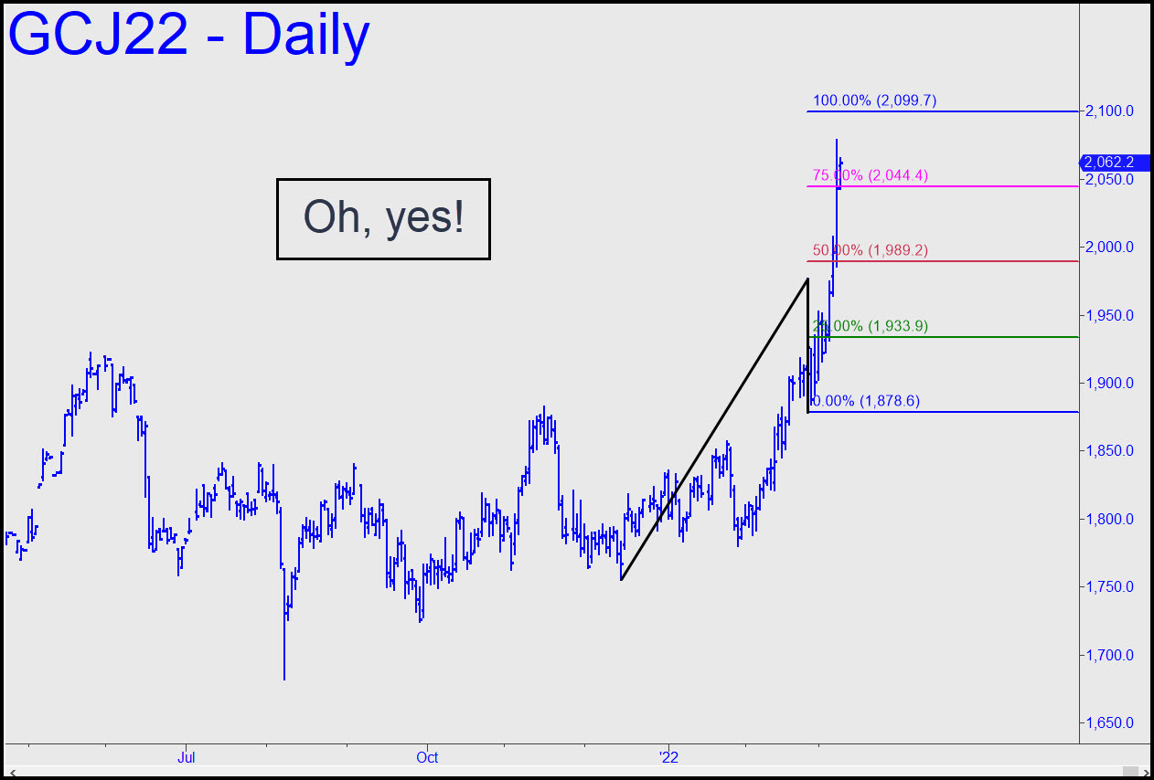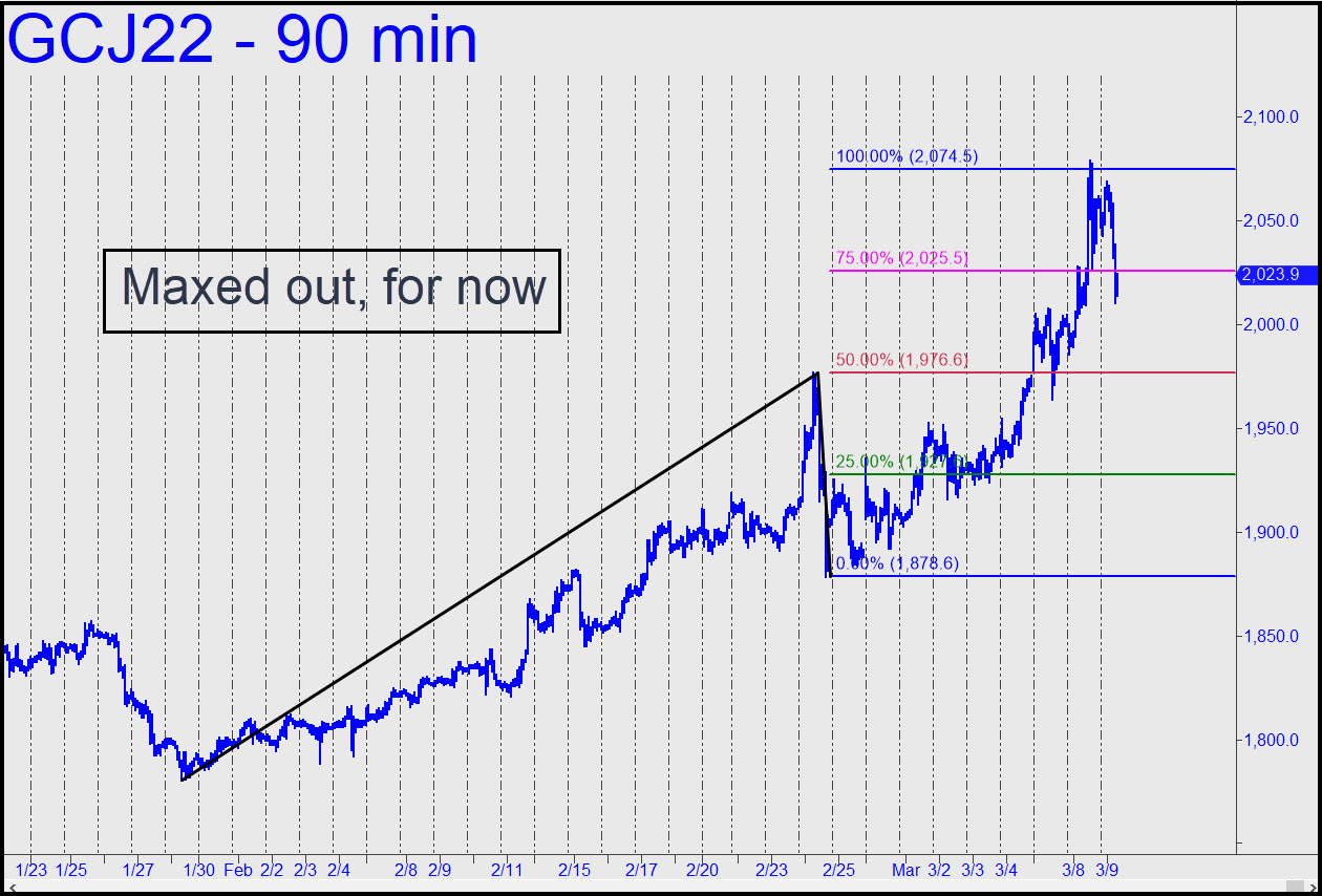 Buyers didn’t exactly obliterate the 1944.20 midpoint resistance on their first attempt to get past it last week, but the futures subsequently appeared to pick up strength when they failed to pull back to the green line (x=1911.40) to gift us with a ‘mechanical’ long. The implication is that the futures are bound for D=2009.75 and all but certain to achieve it. A pullback to p=1944.20 first would trigger a ‘mechanical’ buy with a stop-loss at 1922.30. We can cut the risk down to size in real time, so be sure to tune to the chat room for further guidance when the futures get close to the target. _______ UPDATE (Mar 7, 9:54 a.m. EST): Gold has topped overnight (when else?) a tenth of a percent from the $2009.75 target flagged above. Using the visual technique I detailed in the chat room last week, this was close enough to have set up a low-risk, reverse-pattern short or a precise exit from a long. Anyone do the trade? In any event, here’s the chart. The so-far low of the reversal is 1964.20, a $43 drop from the high. _____ UPDATE (Mar 8, 8:52 a.m.): Ya gotta love the way gold thumbed its nose at the very-round-number resistance, $2000! The next Hidden Pivot resistance lies at 2034.80 within a pattern on the daily chart that dates back to A= 1821.10 (2/11). It will max out at 2066.60 (A=1788.50 on 2/3). _______ UPDATE (Mar 8, 10:42 p.m.): How nice to see gold acting like a FAANG stock! I’ve used the highly unconventional pattern shown in this chart to project minimum upside over the near term to 2099.70. _______ UPDATE (Mar 9, 7:23 a.m.): I’ve ‘discovered’ a new pattern that should have been more obvious to me initially and which somewhat changes my outlook for the near term. It suggests the futures may have maxed out the rally, at least for the time being, with the recent high at 2078.80. This Hidden Pivot lies two-tenths of a percent from the 2074.50 target shown in this chart. The 2099.70 target will remain viable nevertheless, but getting there may require a substantial correction first. We’ll be better able to judge how substantial once we’ve seen whether minor corrective patterns start exceeding their p midpoint supports, or perhaps their ‘d’ targets.