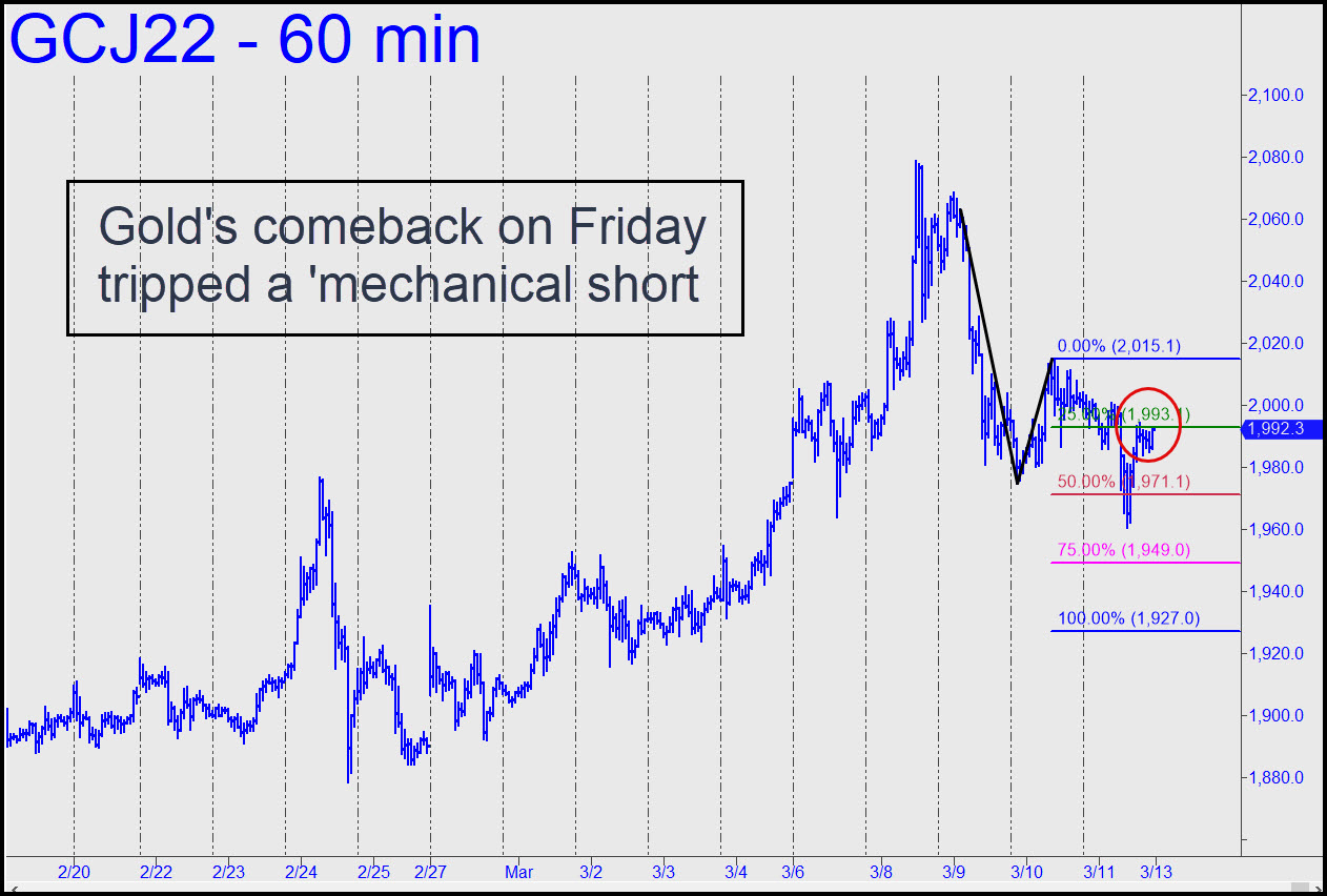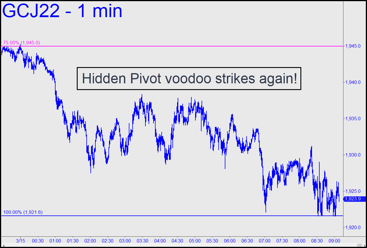 Gold’s feisty comeback on Friday went only far enough to trigger a moderately appealing ‘mechanical’ short at the green line (x=1991.70). We took a pass nonetheless, since no one wants to go home short gold with war and all-out conflagration threatening Europe. The 1921.60 downside target can still be used, but it would not be unusual for a vehicle that’s in a bull market like this one to correct no lower than the secondary pivot, p2 — in this case 1945.00. Alternatively, a move straightaway through C=2015.10 would be hell-of-bullish. ______ UPDATE (Mar 15, 1:20 p.m.) Sellers have dismembered the ‘hidden’ support at p2=1945.00 in order to concentrate on Part II of their plan for tonight: gang rape. _______ UPDATE (Mar 15, 9:09 a.m.): The 1921.60 target has caught the exact low to-the-tick of last night’s avalanche. Sellers have been mau-mauing the Hidden Pivot this morning, but any bottom-fishing done there so far, regardless of the tactic used, would have made money. If you did a trade using my number and still hold a position, please let me know so that I can determine whether to provide tracking guidance. Here’s the chart. _______ UPDATE (Mar 15, 9:20 a.m.): The Hidden Pivot has finally given way under brutal pounding. Structural support lies near 1890, within a head-and-shoulders pattern that has traced out over the last three weeks. _______ UPDATE (Mar 15, 10:45 p.m.): The April contract is still groping for a foothold at the 1921.60 correction target, although the breach of this Hidden Pivot support is not exactly a sign of good health. We’ll move to the sidelines for now.