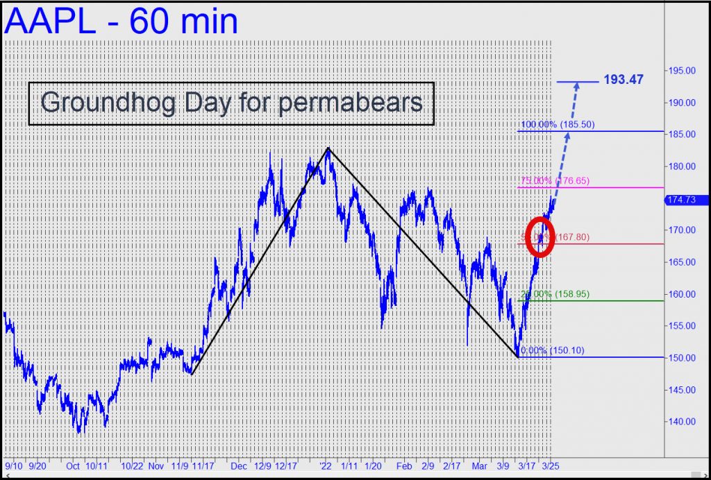 The chart shows that buyers shredded their way past a ‘midpoint Hidden Pivot’ at 167.80 last week. This all but clinched the subsequent 5% rally and minimum upside to the pink line, a ‘secondary’ pivot at 176.65. That is a place where bull moves can stall fatally, and the possibility cannot be ruled out. However, permabears shouldn’t get their hopes too high, since the impalement of p=167.80 was inversely akin to the groundhog seeing his shadow. He did, and it will likely spell at least six more weeks of sunny and mild weather to be endured by pessimists who think a correction worthy of the name is years overdue. If the move easily surpasses 176.50, you can count on more upside to at least 185.50, or even to 193.78. That would pull the stock market higher, postponing Papa Bear’s arrival yet again, as well as a day of reckoning for investors who long ago jettisoned the concept of value.