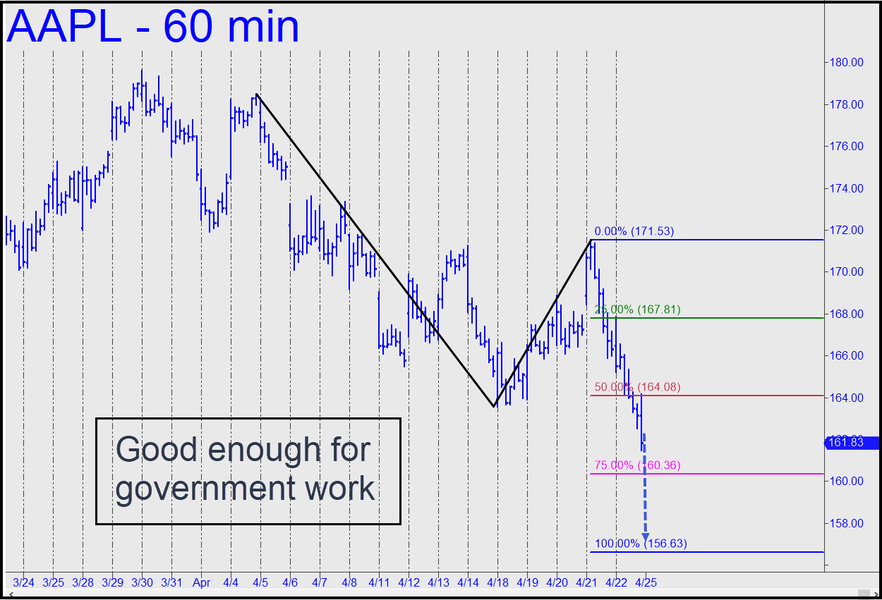 The steep selloff that ended the week should continue down to at least D=156.63 before bulls can mount a strong counteroffensive. The pattern associated with the target looks good enough for government work, although only barely because of its ‘sausage’ point B low. Even so, you can bottom-fish at D if you’re able to keep the entry risk down to perhaps 5-7 cents per share using an entry trigger from a chart of minute degree. I’ll provide guidance on request if I’m in the chat room at the time. ______ UPDATE (Apr 26, 11:47 p.m.): AAPL plummeted $10, but sellers didn’t crash the 156.83 Hidden Pivot until just after the close. Its decisive breach says considerable weakness remains to be spent. _______UPDATE (Apr 28, 10:10 p.m.): After the wicked goosing DaBoyz gave AAPL on the opening bar, shorts never had a chance. After-hours price action has been so violent, however, that there is little point in prognosticating ahead of Friday’s opening.