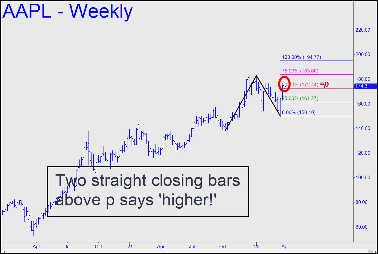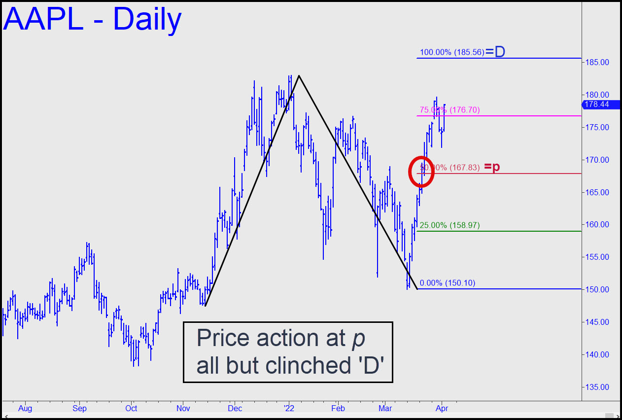 The stock closed above a key midpoint pivot for the second consecutive week, significantly shortening the odds that the 194.77 rally target will be achieved. It also set up a potentially appealing ‘mechanical’ buy if AAPL should surprise with a seeming kamikaze dive to the green line, x=161.27. We’ll find a way to cut the implied $4500 entry risk if and when the time comes, but for now let’s focus on the lesser charts for set-ups that can put us onboard with risk held to a practical minimum. _______ UPDATE (Apr 4, 10:08 p.m.): Buyers have blown past p and D, implying there is every likelihood the stock will hit D=185.56. The 194.77 target of a larger pattern given above remains valid as well. ______ UPDATE Apr 6, 11:35 p.m.): DaBoyz may let AAPL fall to as low as 158.97 before they pounce on it again. That would set up a no-brainer ‘mechanical’ buy, although we might attempt it with somewhat more risk at the red line, p=167.83, stop 161.92. Here’s the chart. Stay tuned to the chat room and switch on your ‘Notifications’ if you care.