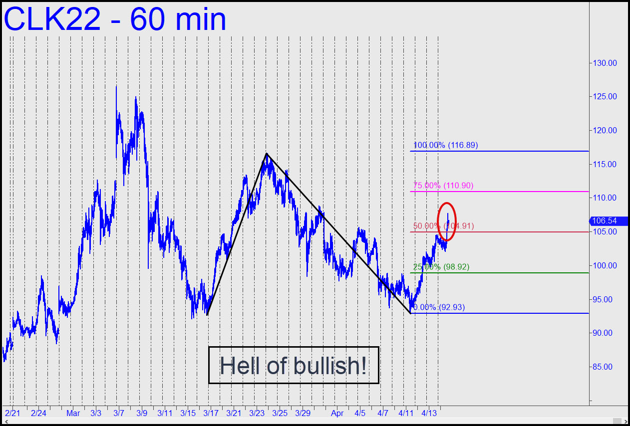 The rally has tacked on $15 a barrel since a Hidden Pivot support at at 93.07 nailed the bottom within 14 cents a week ago. Now, judging from the way in which buyers obliterated the 104.91 midpoint resistance last Thursday, the move is all but certain to achieve the 116.89 target of the reverse pattern shown in the inset. If it gets past that Hidden Pivot with ease, we’ll be looking at more upside to as high as 130.00 by the end of April or early May. ______ UPDATE (Apr 20, 1:07 a.m.): A fall to x=98.92 would trigger a ‘mechanical’ buy with entry risk per contract of $6000 per contract, assuming stop-loss at 92.92. _______ UPDATE (Apr 21, 11:38 p.m.): The mechanical buy triggered at 102.30, basis the June contract, and a subsequent rally to 104.32 could have been used to exit with a decent partial profit. If anyone is still on board, please let me know in the chat room so that I can determine whether to establish a tracking position.