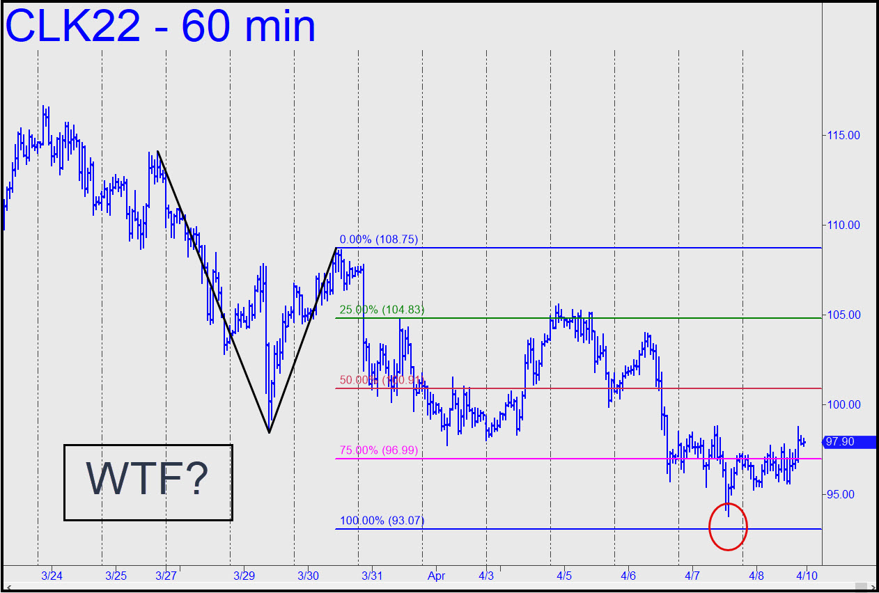 The pattern shown is so wickedly gnarly that I’m surprised last week’s low did not occur within pennies of the 93.07 target. I would be logical to infer that a bottom is in and that the futures are telegraphing strength in the week ahead, and so we shall. But I will also suggest keeping an open mind to the possibility of a relapse to the target, since that would enable us to bottom-fish with risk under very tight control. ______ UPDATE (Apr 11, 9:04 a.m.): Now that’s more like it. The futures did in fact relapse to a 92.93 low just a millimeter below my target. This allowed traders to get long in numerous ways that could have been worth anywhere from around $600 to $2000 so far. This chart shows how you could have set up a conventional ‘camouflage’ trigger at the green line, x=93.73. ______ UPDATE (Apr 13, 10:50 p.m.): Just a smidgen to go before we can gauge the fledging uptrend’s strength as it interacts with p=105.03. As always, an easy penetration would portend more upside to D=117.01. Here’s the chart.