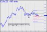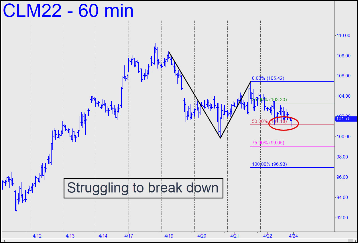 June Crude validated the bearish pattern shown on Friday with a day-long game of toe-sies at the red line. That’s a Hidden Pivot midpoint support at 101.18, and its decisively breach would signal more downside over the near term to at least p2=99.05, or possibly to D=96.93 if any lower. So far, however, the breach has been slight, and it would therefore be premature to offer odds of a further fall. In the meantime, we can look to get short ‘mechanically’ on a rally to the green line, but I am recommending that the trade be initiated only via ‘camouflage’. In practice, that would mean using a downtrending ABCD pattern on a 15-minute chart or lower to set up a trigger.______ UPDATE(Apr 25, 5:12 p.m.): Crude’s plunge crushed all of the Hidden Pivot supports identified above, sending the June contract into a boring void of white space on the daily chart. Adding to the boredom was the return of the June futures to the midway point of the intraday range. UPDATE (Apr 28, 10:19): The picture is still moderately bullish but boring.