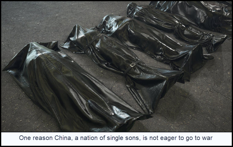 (A longtime reader who has been in China traveling on business for months pointed out that due to the single-child policy–only recently lifted–Chinese families have only one son, and they are averse to that one son coming home in a body-bag as a casualty of a “war of choice” or indeed, any war.)