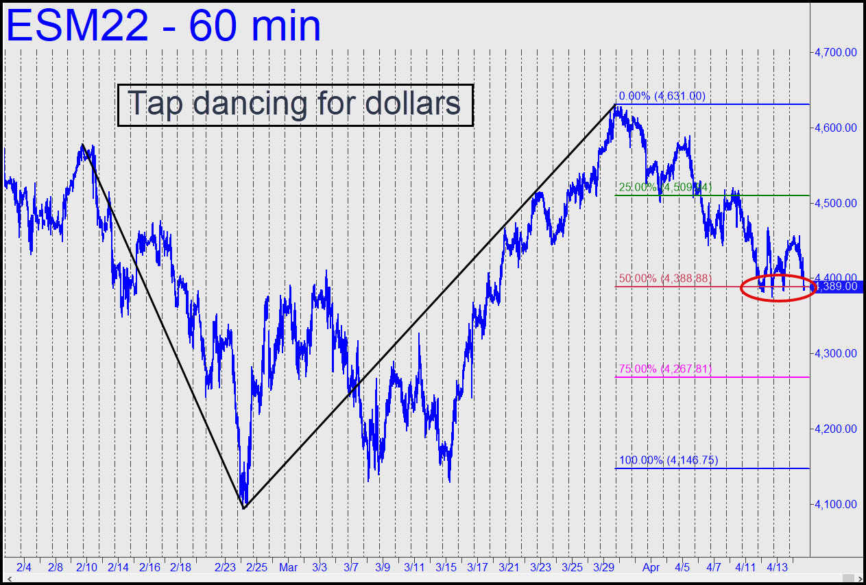 The little hoser spent most of the week tap dancing on a 4388 midpoint Hidden Pivot that had served as our minimum downside objective. Its decisive breach would make further slippage to D=4146.75 more likely, but sellers have looked so gutless lately that we shouldn’t take this for granted. More immediately, p2=4267.82 can be used a a minimum downside objective for the near term. I still doubt that bulls have the strength or enthusiasm to stop out C=4631 of the bearish pattern, but let’s keep an open mind, lest they use some inscrutable pronouncement from Powell & Co. to catalyze a volume-less short squeeze. _______ UPDATE (Apr 20, 11:22 p.m.): Just a little more upside to x=4510 would trigger a mechanical short, stop 4631.25, but I am recommending the trade only to subscribers who can cut the implied entry risk of $6,000 per contract down to $240 or less. In practice, this will require a ‘camouflage’ set-up on the 15-minute chart or less. _______ UPDATE (Apr 21, 11:24 p..): The futures plunged 70 points after topping a single point from the 4510 benchmark flagged above. No one mentioned getting short as the tout update had suggested, even though I posted instructions for initiating the trade belatedly with a mechanical trigger.