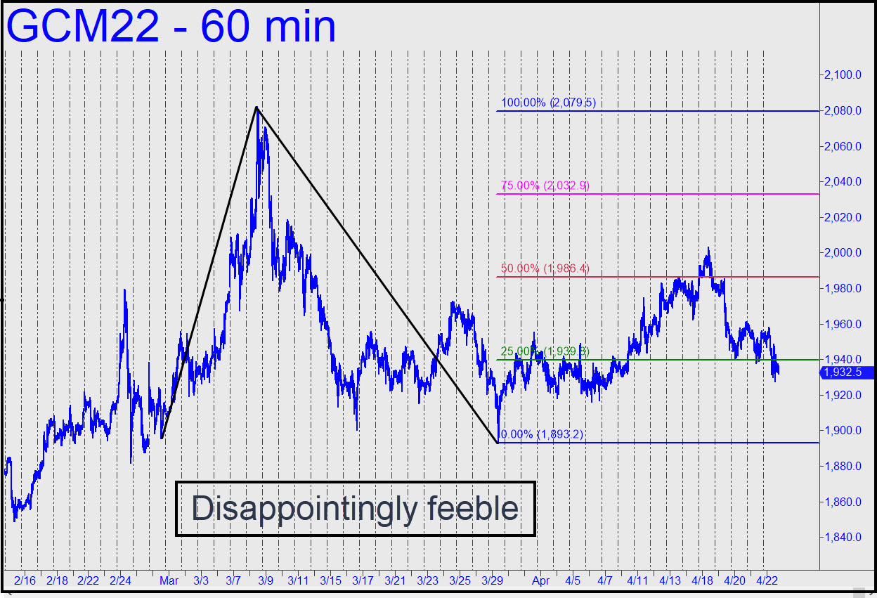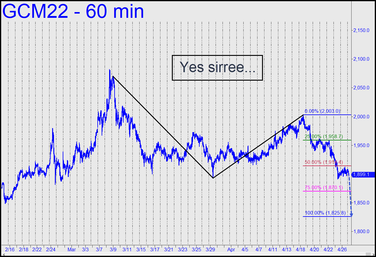 Subscribers should have exited a profitable long trade using a 1942.30 stop-loss before the futures turned limp on Friday. The fact that a moderately appealing ‘mechanical’ play didn’t work better suggests weakness will be the coming week’s theme. But probably not too much of it, since sellers have not shown much gumption either. My gut feeling is that DaBoyz will stop out C=1893.20 before they gratuitously reverse until hopes are high enough to dash yet again. Set your snooze alarm for 2018.40, a tick above an ‘external’ peak recorded on March whose breach would signal a bullish resurgence. _____ UPDATE (Apr 25, 5:04 p.m.): After plunging sharply overnight, the reversal came exactly as anticipated, from a hair below C=1893.20. One subscriber reported making hay with the $13 rally that ensued. The futures spent the rest of the day playing footsies with ‘C’, leaving me with little more to say at the moment. _______ UPDATE (Apr 26, 11:55 p.m.): Although June Gold has bounced from precisely where we’d anticipated, the countertrend has been weak. This has activated the bearish pattern shown in this chart, with a D target at 1825.80. It is an odds-on bet to be reached because of the easy with which the downtrend penetrated p=1914.40, then made it resistance. _______ UPDATE (Apr 28, 10:16 p.m.): The futures bounced sharply off p2=1870.10 of the bearish pattern that projects to 1825.80, delaying a still-likely fall to that number. This has activated Matt’s Curse in a bullish way, although I’d need to see the rally surpass 1922.80 before I change my tune.