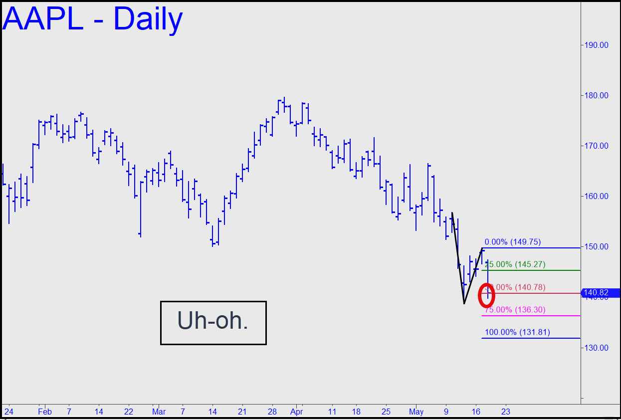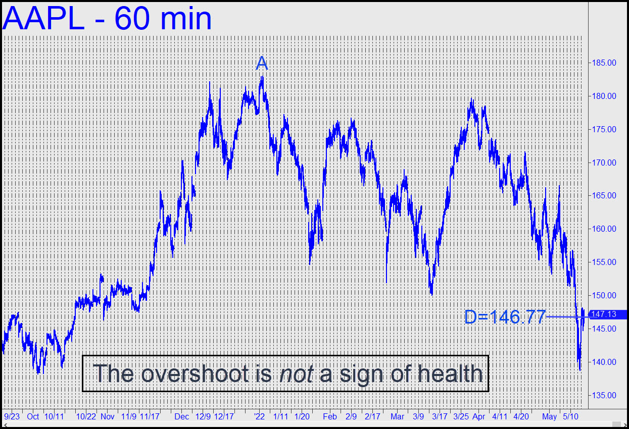 AAPL, the crown jewel of the institutional investment world, has lost more than 20% of its value since January. Last week it signaled still lower lows down the road when it deeply pierced a case-hardened floor of Hidden Pivot support at 146.77. But how far down the road? My hunch is that last week’s bounce on Thursday from a bombed-out bottom at 138.80 will prove to be the start of the most powerful short-squeeze since January. As such, and according to design, it will devastate bears who have grown complacent betting against the biggest portfolio managers in the world. The fact that the squeeze began off a bottom on Thursday, giving the stock a running start for a psychotic leap into freaky Friday (the 13th, no less), is evidence that DaBoyz are taking no chances. They do not want this rally to flame out quickly like all the others that nipped at shorts’ privates in April. The stock will still need to take quite a leap, to 156.75, merely to generate an impulsive leg on the hourly chart. Expect DaBoyz to succeed at this project — the earlier in the week the better for them. _______ UPDATE (May 18, 6:34 p.m.): The small dip below the red line has shortened the odds of a further fall to D=131.81 of this pattern. Also, a rally to x=145.27 would trigger a ‘mechanical’ short, stop 149.76. Check the chat room for for timely guidance, since the appeal of this trade will depend on how and what time of day ‘x’ is hit.