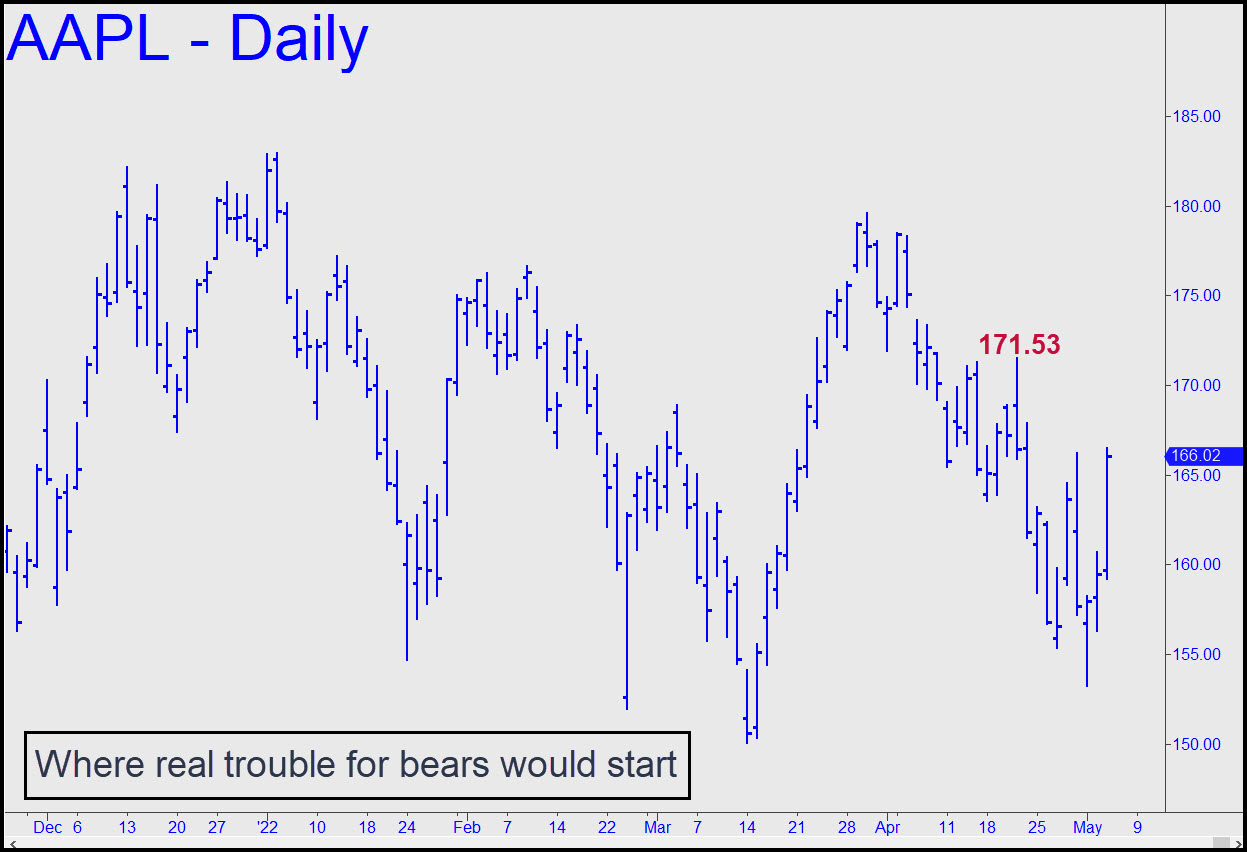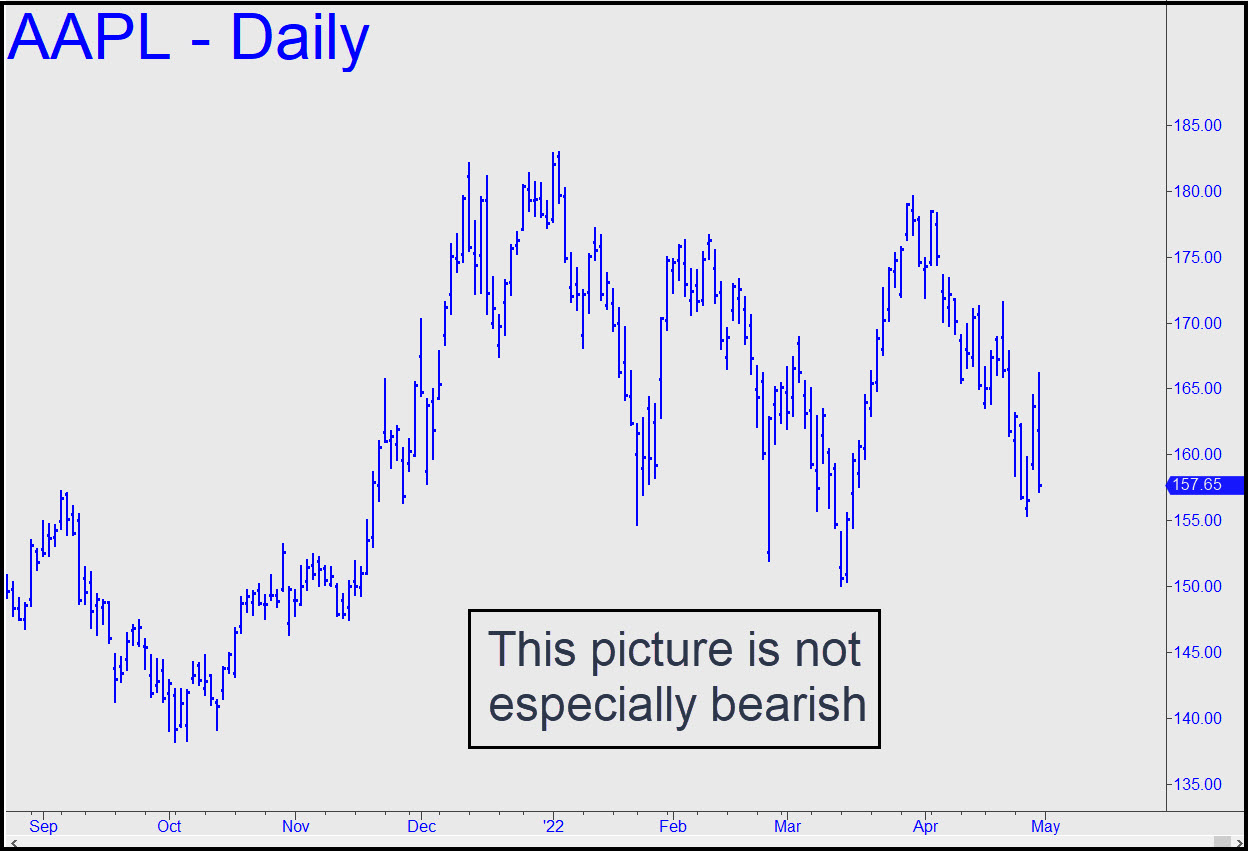 As pleasant as it may have been to see AAPL get its ass kicked last week, this didn’t make the chart any more bearish. For the time being, that’s why we will continue to use the nastier but more predictable chart of the E-Mini S&Ps to tell us exactly what’s going on. I don’t want to count on the rightmost 7 or 8 bars of the chart to give us a pattern and a downside target, since the would-be A-B leg did not exceed any prior lows. However, it is good enough for government work, and that’s why I expect D=150.06 to synch up with the 3994 target we are using in the E-Mini S&Ps. Moreover, it can be bottom-fished, and the ersatz pattern used to get short ‘mechanically’, since this particular entry tactic has so much forgiveness built into it. ______ UPDATE (May 4, 11:08 p.m.): We shouldn’t expect the thieves, pederasts and carnival geeks who have worked this stock since 2009 to go quietly into the night. The current, rip-your-face-off short squeeze has been impressive over the last three days, but it would still need to take out the 171.53 peak shown in this chart before it becomes a serious menace to bears’ well-being. _______ UPDATE (May 5, 9:37 p.m.): Today’s relapse took the menace out of AAPL’s ferocious short-squeeze earlier in the week. Now, look for a test of the 150.10 low recorded on March 14.