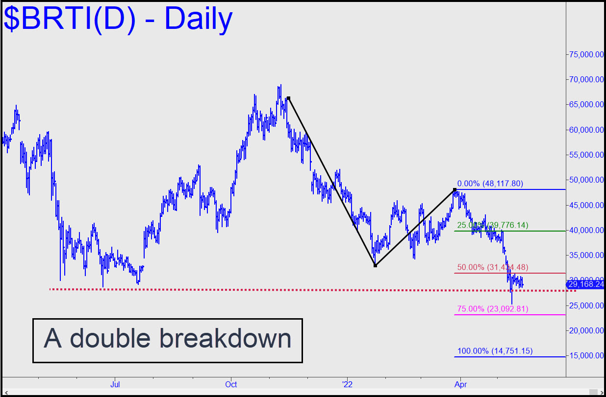 Although we might have expected Bertie to get some respite after completing a head-and-shoulders pattern over the last ten months, it is instead breaking down again. Mid-May’s breach of an important Hidden Pivot midpoint support at 31,434 hinted that bitcoin’s long dirge since peaking near 70,000 last November is not over. However, the May 12 stab beneath the H&S pattern’s ‘floor’ implies things may be even worse than they had seemed. Accordingly, we’ll stick with the 14,751 target for now while allowing for the possibility of a tradeable bounce from p2=23,092. For now, you can use that secondary pivot as a minimum downside target. _______ UPDATE (May 31, 11:03 p.m.): Bertie’s bullish wilding spree may have seemed impressive, but it noticeably failed to exceed the middling ‘external’ peak shown in this chart. This is a subtle sign that the rally is unlikely to get legs, so be prepared.