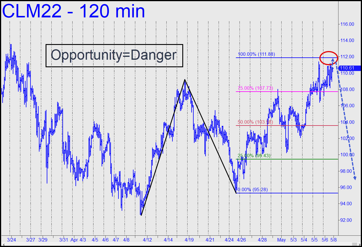 Two days of pussyfooting an inch from my 111.88 target has killed my enthusiasm for getting short there. Although I would ordinarily view the week’s pooch-screwing price action as consolidating for an upthrust, I’m still tempted to use the target to get short as originally planned. It can be done with an rABC set-up using an a-b interval as tight as 40 cents. If you understand this instruction, you’re qualified to do the trade. If it gets stopped out, take it as a hint of more upside to at least 116.25, or 124.87 if any higher. ______ UPDATE (May 9, 6:20 p.m.): The futures could have been shorted with an rABC set-up as advised, but only after applying imaginative genius, since they never even got close to 111.88 before tanking.