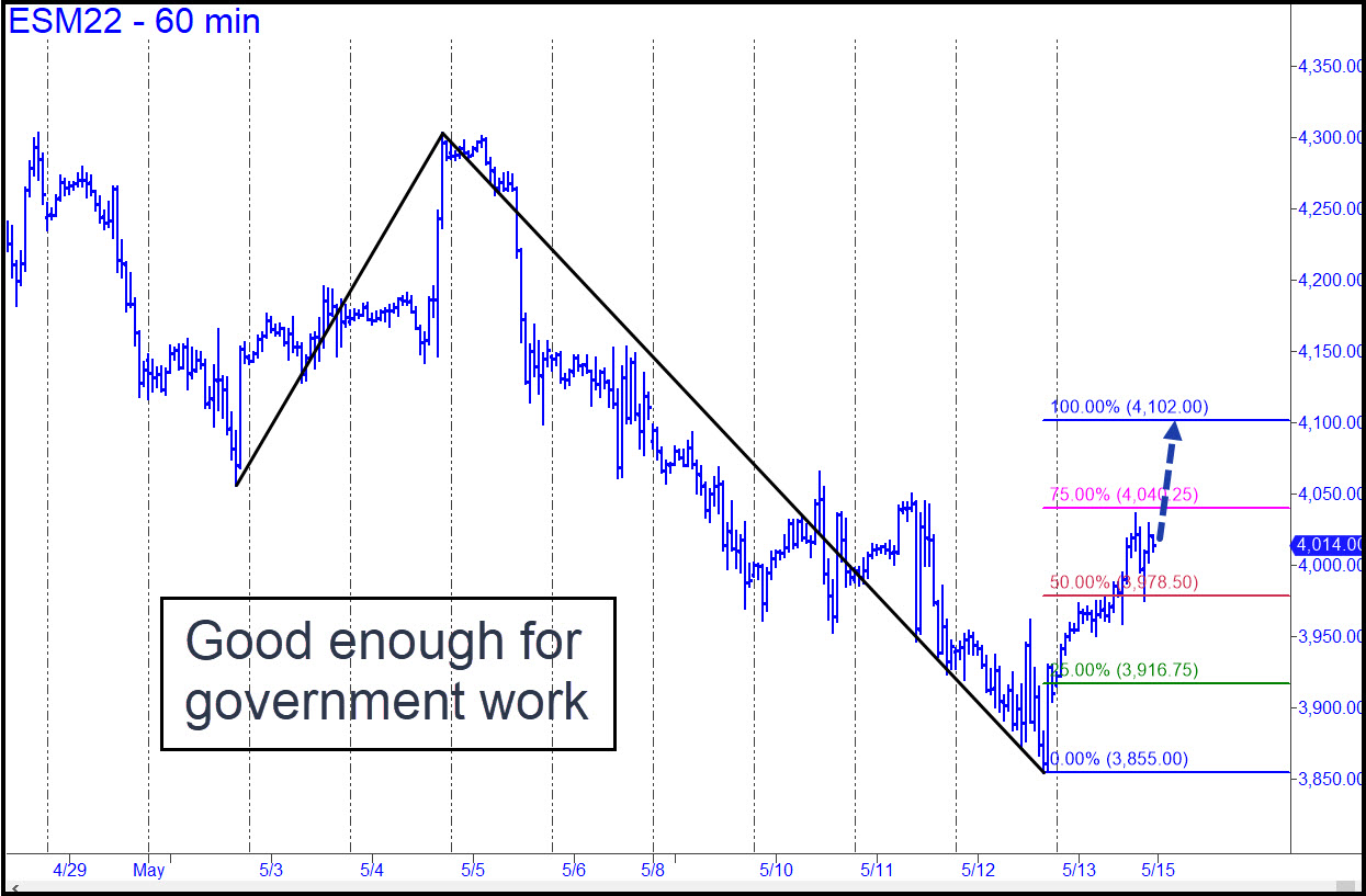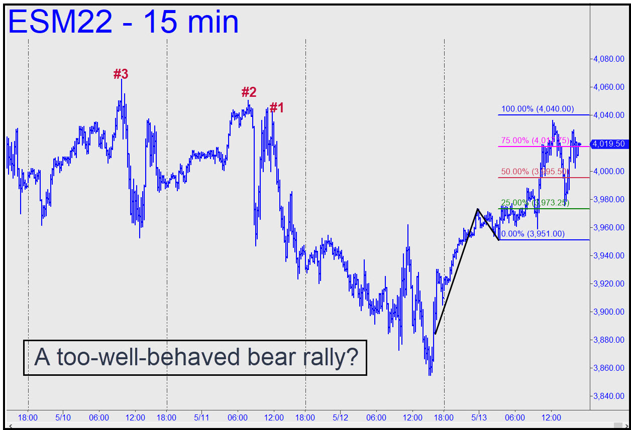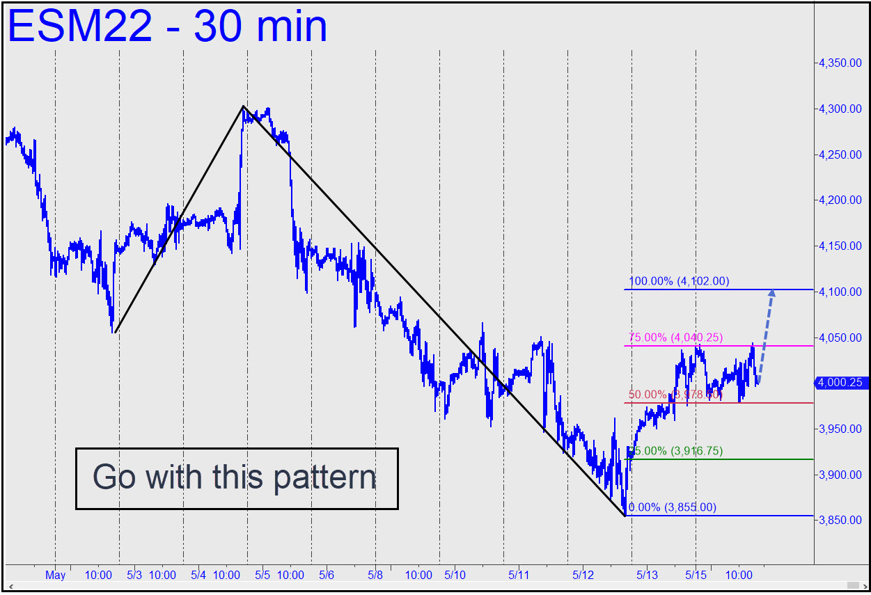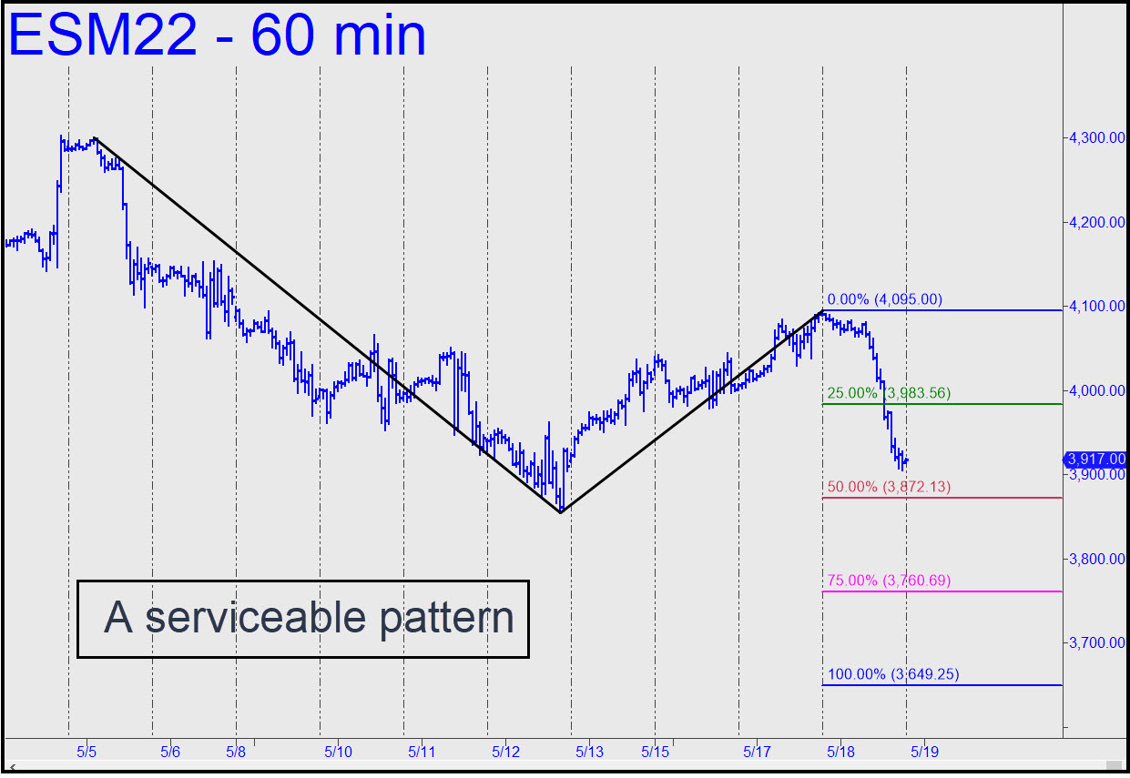 Friday’s bear rally was not particularly impressive, and we could probably write it off had it occurred on any other day of the week. But because it left shorts bleeding on the ropes ahead of the weekend, they are likely to provide buoyancy when index futures resume trading late Sunday afternoon. The three labeled peaks will pose an immediate challenge, but we should expect them to give way if there is no particularly unsettling news over the weekend. If you or I were the criminal masterminds who rig the markets, this is how we would set things up to maximize the power of short-covering and other buying behavior related to the calendar. Short-covering rallies are engineered to achieve heights that mere bullish buying never could, and that’s why we we should expect the rally to continue. For now, use the 4102.00 ‘D’ target of this reverse pattern as a minimum upside objective. The Hidden Pivot levels can also be used for ‘mechanical’ entries or to get short at D. If it’s easily exceeded, bears may be facing a tough week. ______ UPDATE (May 16, 5:35 p.m.): Buyers went nowhere, but that was impressive, given the quickening drumbeat of news concerning the implosion of China’s economy. Use this pattern, a slightly evolved version of the one above, with a 4102.00 rally target. _______ UPDATE (May 18, 1:15 p.m.): Minor downside targets have supported only feeble bounces so far (see my 10:06 rec in the Trading Room), but the p midpoint of this pattern will likely work better. Today’s decisive move below ‘x’ implies that ‘p’ is all but certain to be reached. I am not publishing the actual price associated with p to avoid making it too visible._______ UPDATE (May 18, 6:12 p.m.): Here’s my third correction of the bearish pattern, with a midpoint support too close to last week’s low to consider it reliable for precise bottom-fishing. It may work anyway, but I’d suggest the trade only if you can cut the risk significantly by using a ‘camouflage’ set-up. The pattern will work perfectly well, however, for purposes of gauging trend strength and the likelihood of a further fall to ‘D’. Click on this link or the one above to see both HP levels. _______ UPDATE (May 19, 6:50 a.m.): The strength and persistence of the downtrend continues to impress, now with more evidence that DaBoyz are unable to exhaust sellers overnight. Last night’s plunge somewhat exceeded p=3872.00, eventually finding a presumably temporary bottom in a desperate place, as anticipated, just a split-hair above last Thursday’s low (which itself was a hair above a Hidden Pivot support I’d billboarded). There has been almost no bounce from this very bounce-able spot, and the leadenness feels ominous. DaSleazeball’s firing squad will attempt to corral and frighten as many shorts as possible between now and the opening, but they would need to hoist this sack of bricks above 3900, or better still above the 3933.00 peak recorded overnight, to fool anyone into thinking the rally is going somewhere.