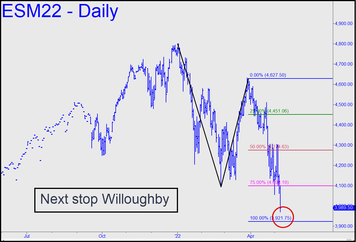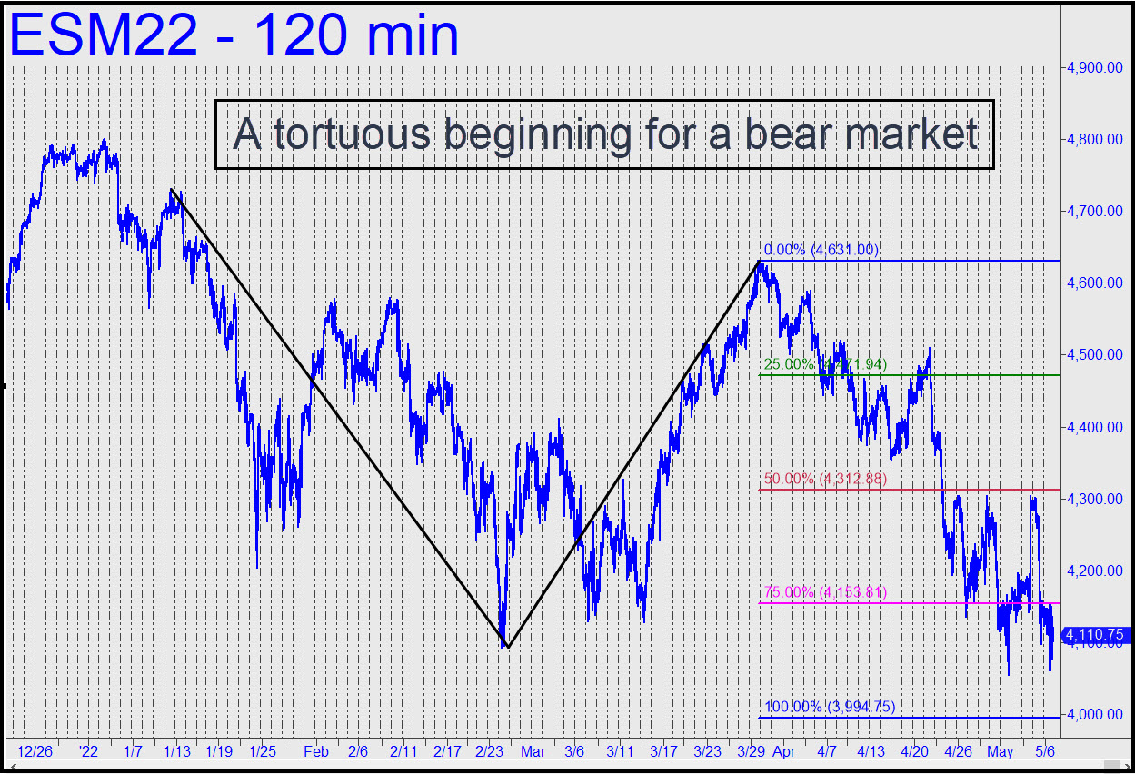 The chart shows the tortured psyche of a bear market in its infancy. There have been no particularly memorable downdrafts yet, just a paltry three-percenter in the Dow last week that was overshadowed by an even more-deserved sell-off in the lunatic sector. There is only discouragement and anxiety at this point, but no real fear. And why should there be? If Thursday’s psychotic, Fed-induced short-squeeze had continued for just one more day, it would have brought the S&Ps to within betting distance of new record highs (!). As things stand, it scared the bejeezus out of traders who’d grown too comfortable shorting into every rally that occurred in April. For trading purposes, continue to use the 3994.75 target as a logical place for a tradeable low. It has grown too well exposed by now to work precisely for bottom-fishing, but price action there will at least give us a firm handle on the downtrend’s strength at this very early stage of the bear. _______ UPDATE (May 9, 5:26 p.m. EDT): The futures dove to the 3994.75 target this morning, then spent the rest of the day screwing around with it. The close was beneath this Hidden Pivot support, however, following a 3970 low that represented more than just a slight breach. Accordingly, I’ve shifted point ‘A’ up to the marquee high to produce a still lower target at 3921.75. That will be the end of the line for the bear cycle begun from 4800 on January 4, so look for a long, sustained bounce after 3921.75 is touched or very closely approached. (The bounce may already have begun, but I doubt it. ) D=3921.75 can be bottom-fished with a ‘camo’ set-up, since it is extremely unlikely to be significantly exceeded the first time it’s hit. Here’s the chart. _______ UPDATE (May 11, 10:25 p.m.): Dave Isham corrected my target to 3925.25, meaning today’s low at 3920.25 occurred 0.1% below it. The feeble bounce so far is not encouraging. _______ UPDATE (May 12, 8:48 a.m.): Check my Trading Room post for a chart with a new target. _______ UPDATE (May 12, 9:52 p.m.): The futures have bounced 110 points from a low at 3855.00 that fell just five points from the target I posted (with chart) in the chat room before the opening. The rally is not yet impulsive on the hourly chart but would become so with a print at 3986.00.