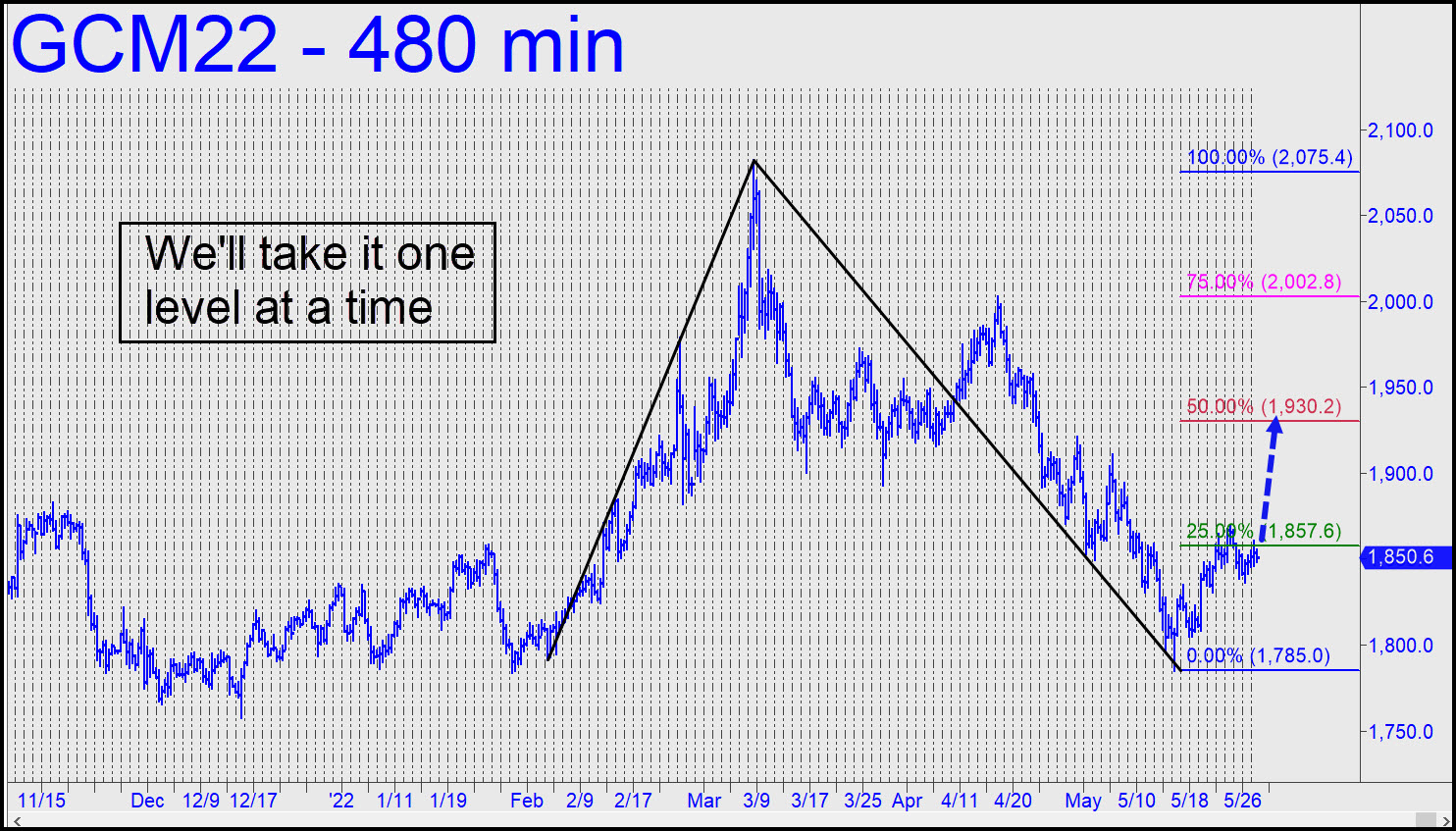 The most bullish thing you could say about this sack of cement is that the May 16 low at 1785.00 did not quite reach its ‘D’ target. That’s why I am returning to a big-picture pattern that is bullish, even if its ‘D’ target at 2075.41 greatly exceeds our expectations at the moment. A theoretical ‘buy’ that triggered last week implies a rally over the next 5-7 days to p=1930.20, the pattern’s midpoint Hidden Pivot. We’ll be better able to judge whether the move is likely to hit D once we’ve seen buyers interact with that number. If it is impaled on first contact or the futures close above it for two consecutive days, that would shorten the odds of a continuation to 2075. ______ UPDATE: (May 31, 10:39 p.m.): Today’s funereal price action raises the question of whether the future can even reach the midpoint pivot, let alone interact with it. The theoretical buy signal is still in effect, although there is no good reason to actualize it. The good news is that gold will rally, although not too far, once we have become despairing of the possibility.