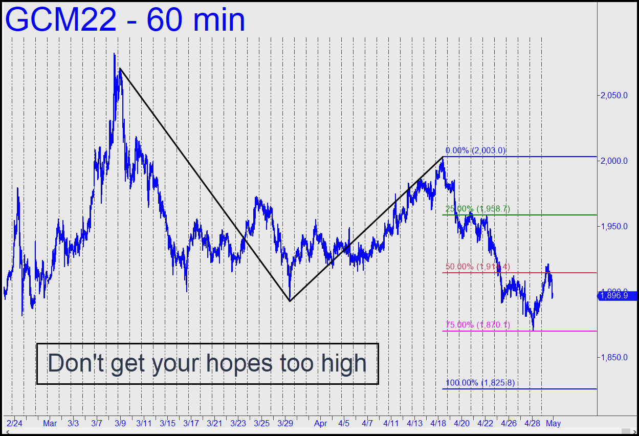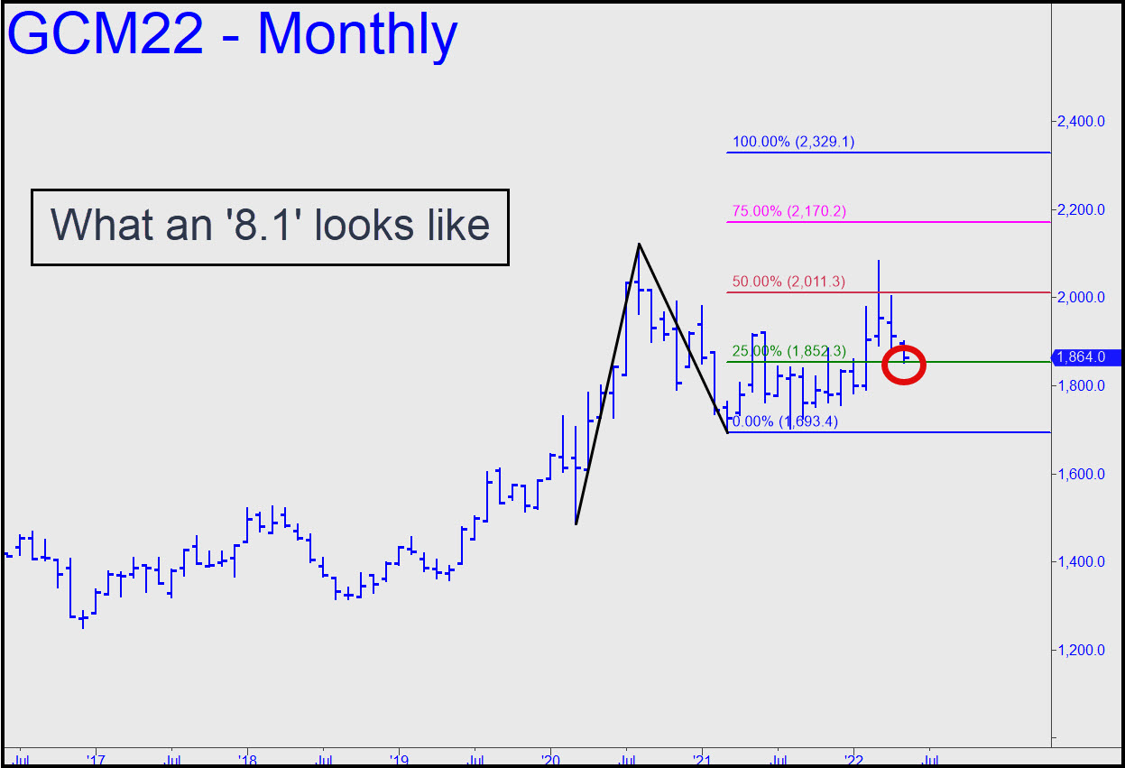 The week ended with a feebly impulsive rally, so we shouldn’t get our hopes too high that the June contract will somehow avoid a predicted fall to at least the 1825.80 target of the pattern shown. It ha s been working fairly well for trading purposes although, strictly speaking, the rally to the red line on Friday did not trigger a valid ‘mechanical’ short because it came from a low that missed touching p2 by a hair’s breadth. ______ UPDATE (May 2, 6:47 p.m.): Mechanical trades rated higher the ‘7’ are rare, but here’s one that triggered today — on the monthly chart, no less! With more than $60,000 of initial risk on four contracts, however, this is one you should either paper trade or execute using ‘camouflage’ in the full-size contract or the mini. My target for the corrective move, basis the June contract, suggests the futures will go lower, to at least 1825.80, before they can turn around. The 2329.10 rally target is hardly a done deal, but it is not looking too shabby for the long term, given the way buyers impaled p=2011 in March. _______ UPDATE (May 4, 10:45 p.m.): So far, so good! The corrective rally implied in my last update has traveled $50 since bottoming. This occurred a millimeter from an 1852.30 low I’d rated 8.1 for ‘mechanical’ longs. Anyone aboard? _______ UPDATE (May 5, 9:31 p.m.): Yet another promising rally turned to dross when the futures reversed near the opening and gave up nearly all of the previous day’s gains. I’ll have little more to say ahead of the weekend.