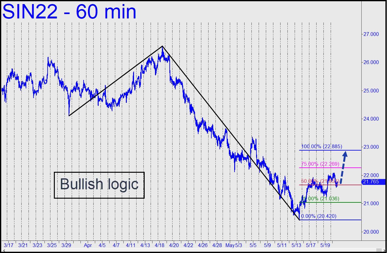 A pattern identical to gold’s projects a rally to as high as 22.88 over the near term, although the latter has performed more bullishly recently. There have been no ‘mechanical’ buying opportunities since the futures bottomed ten days ago, but one would be signaled on a pullback on Monday to x=21.03. Bulls should be careful near ‘D’, since the target is sufficiently compelling to suggest a short-able pullback will occur there.