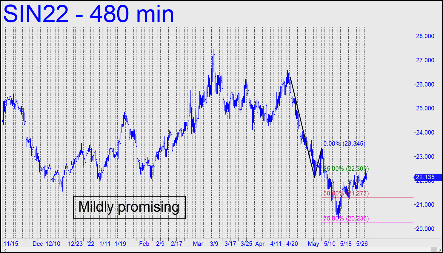 Like gold, silver did not reach a Hidden Pivot target on the last selloff, and so I’ve chosen to display a mildly bullish ‘reverse’ pattern to determine where the futures are likely to head next. Use the 22.71 target as a minimum upside projection for the near term. If it is easily exceeded, we can shift our sights up to the 23.94 ‘D’ target of a larger reverse pattern. It can be located by placing the ‘a’ coordinate on the 23.93 low recorded on February 24. That number looks likely to stymie bulls, but a decisive move through it would be the most positive sign we’ve seen in silver since February.