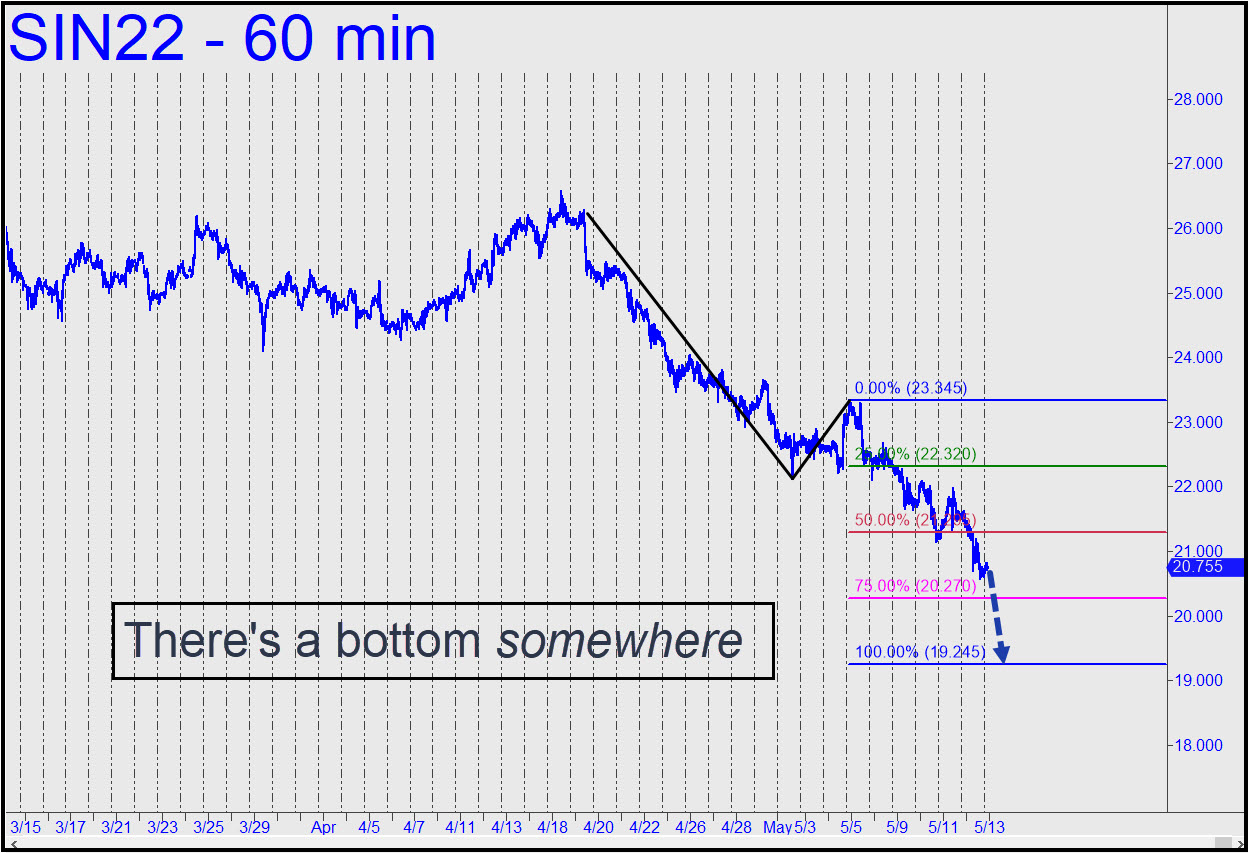 I’ve left Silver on the list this week only as a placeholder, since its chart says absolutely nothing to me. The corresponding chart in gold is somewhat more bullish, and I’ve said so. However, it is not so bullish as to suggest it will pull silver higher any time soon. The July contract would need to push past the ‘external’ peak at 23.65 made on April 29 to get our attention, but until such time as that happens, expect meaningless feints in both directions as bulls and bears duke it out for control of…not much. _______ UPDATE (May 12, 10;05 p.m.); There’s a bottom somewhere, although bulls could be pardoned for thinking this time may be the exception. Here’s a chart that shows two possibilities, respectively, at 20.27, or 19.24 if any lower.