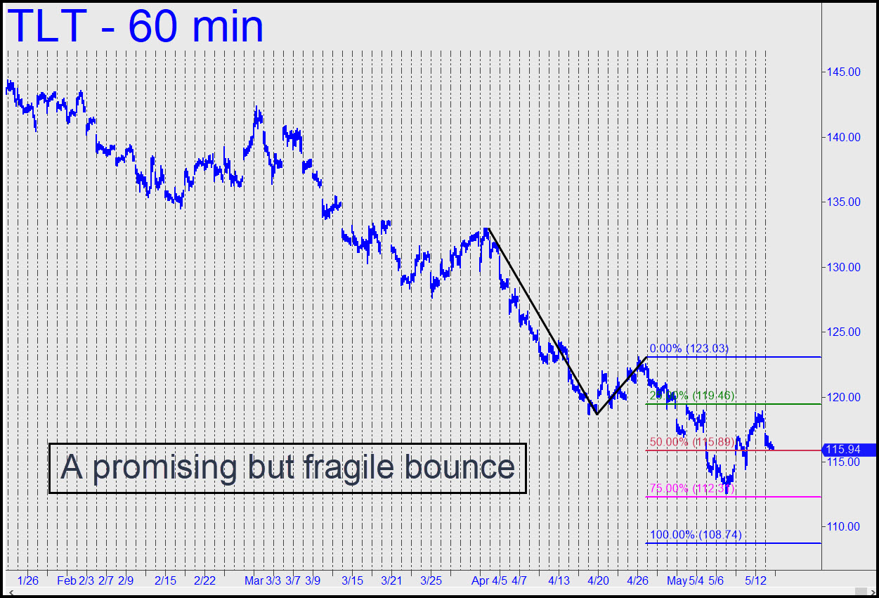 TLT has taken a promising but still-fragile bounce from the 112.31 secondary Hidden Pivot of the pattern shown. When reversals occur at p2, they sometimes continue in the same direction, eventually stopping out the pattern with a move through ‘c’ — in this case 123.03. This dynamic is called ‘Matt’s Curse’, named for the subscriber who first observed it, and in this case the implications are bullish. The rally would become less tentative with a pop above the ‘external’ peak at 119.31 recorded on May 3. ______ UPDATE (May 24, 10:05 p.m.): The short-squeeze gap on the opening kept the rally alive by generating a fresh impulse leg on the daily chart, albeit by a hair. The next thrust must exceed 120.35 to keep the elevated mood stoked.