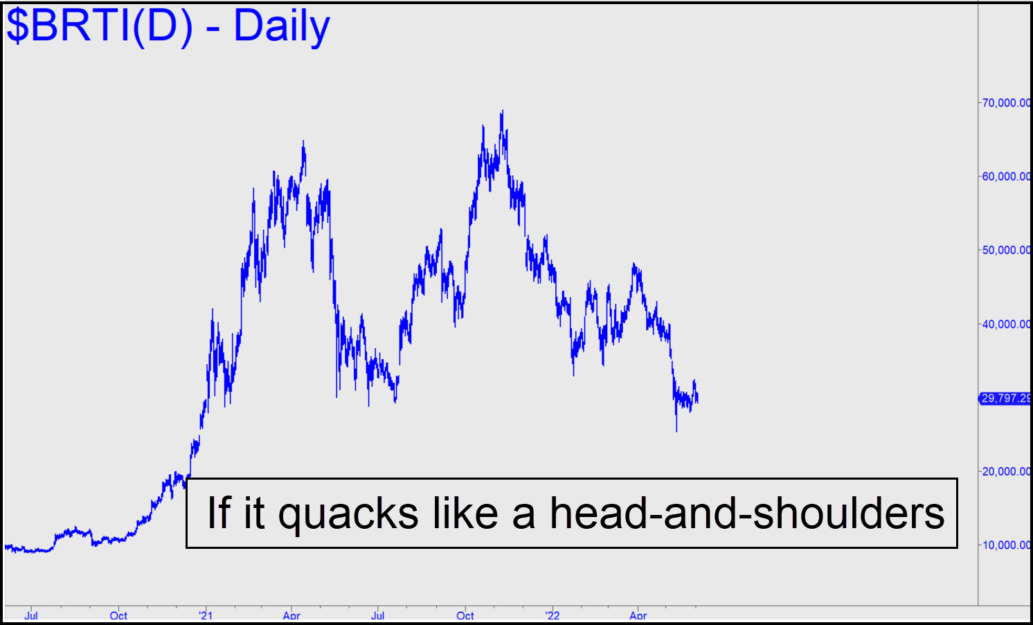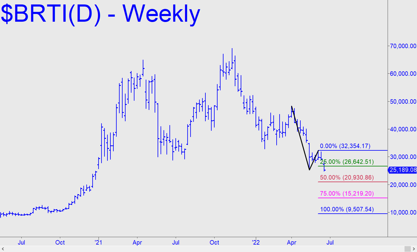 I have little to say about Bertie, other than that it continues to be as interesting as a bowl of grits. Bitcoin’s deep-pocketed sponsors seem capable of maintaining a cruising altitude just below $30k indefinitely, and of popping it a few thou whenever conditions are right and they feel like mau-mauing skeptics. Although the May 12 spike down to $25k generated a quite powerful impulse leg, bears have been unable to do anything with it. For that reason, I am taking the obvious head-and-shoulders pattern as evidence that bitcoin is consolidating for a leap in a month or two to $65k or so, although not to new all-time highs. ______ UPDATE (June 11): Zzzzzzzzz. Head-and-shoulders pattern aside, I am unable to imagine a reason for such speculative fervor as that target would imply. It would reflective crazy-bullish sentiment that seems unlikely to return to securities markets for a long, long time. ______ UPDATE (June 12, 11:43 p.m.): I’d hate to be mistaken for a bitcoin bull just because I was fleetingly intrigued by an incipient head-and-shoulders formation that has turned to ca-ca with tonight’s so-far $4,000 dive. I’d put out a 14,751 target in May which remains valid. To restore my bear bonafides, here’s a pattern with a 9507 target I’ll start liking if sellers shred the midpoint Hidden Pivot support at 20,930. For now, that can serve as our minimum downside objective.