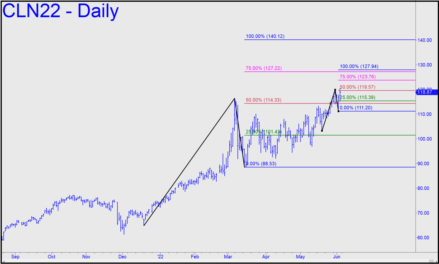 We’ve been using 140.12 as a big-picture target, but let’s focus on a lesser one at 127.94 for now. Friday’s tentative stab through the 119.57 midpoint resistance associated with the latter number, a Hidden Pivot resistance, was not sufficient for us to infer that a continuation of the rally to at least 127.94 is a done deal. However, a pullback to the small pattern’s green line would trip an enticing ‘mechanical’ buy. Since entry risk would exceed $4k per contract, the trade is suggested only for those who know how to cut the risk down to size with a camouflage set-up. _______ UPDATE (Jun 16, 10:40 p.m.): During today’s ‘requests’ session, I raised the possibility that crude had made an important top earlier this week at 123.68. If so, it will likely be found to have been attributable to the collapse of China’s manufacturing sector and the prospect of global recession. Let’s move to the sidelines for now.