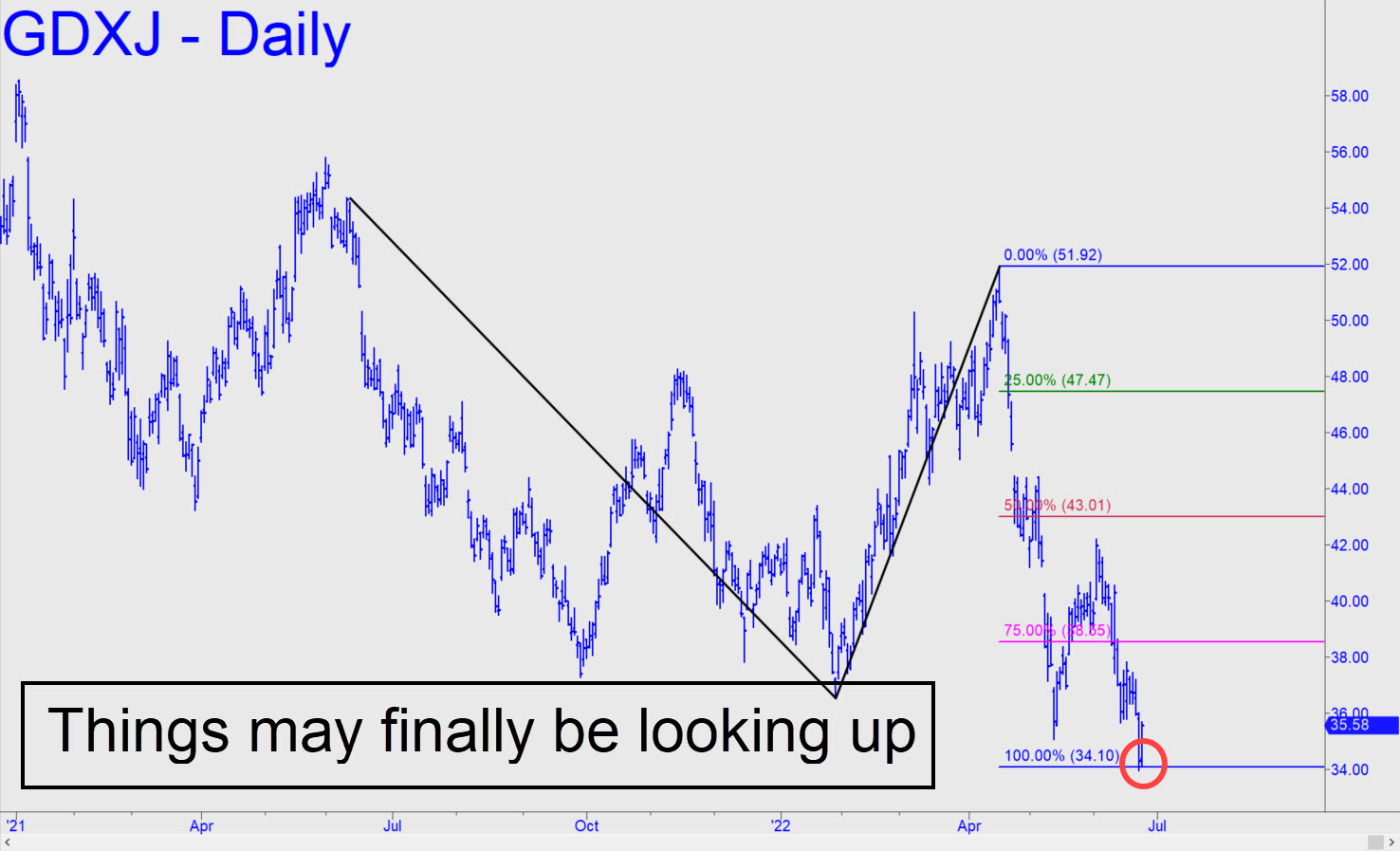 GDXJ bounce sharply Friday off a major downside target that has been a year in coming. I was reminded by a Pivoteer in the Trading Room that I had characterized the 34.10 ‘D’ target shown in the chart as a potential back-up-the-truck opportunity for bulls who have been patiently waiting for this cinder block to hit bottom. And perhaps it has, since the pattern is far too gnarly to have been queered by village idiots and algos who seem, finally, to have gotten the hang of reading conventional ABCD patterns. This one would not likely have been on their radar, even if it represents radical perfection in our playbook. It helps, too, that I myself had forgotten about the target and haven’t mentioned it in a long while. If you bought the low on Friday, please let me know in the chat room so that I can establish a tracking position. ______ UPDATE (Jun 28, 7:14 p.m.): Much as this little p.o.s. would love to keep falling just to make sure every bull has been squashed like a bug, it’s going to have one very tough time taking out the 32.68 Hidden Pivot support shown in this chart. Speculative buying, tightly stopped, is strongly encouraged, especially if you made money on the way down. Rookies looking for action can bid 32.71 for 200 shares, stop 32.49. _______ UPDATE (Jun 30, 3:54 p.m.): This turd is really starting to stink up the place. I’ve given up caring or even believing there has to be a bottom. But for anyone who is somehow still interested, the next logical downside target is 29.92. Bottom-fishing there is recommended if your hobby is losing money. Here’s the chart. ______ UPDATE (Jul 6, 1:59 p.m.):This bathyscaphe has bobbed up from a low today at 29.82. How shocking! See the chat room discussion, which includes a ‘forced’ bottom-fishing trade in August Gold that is currently taking on water. ______ UPDATE (Jul 7, 6:12 p.m.): GDXJ has lifted tentatively off a 29.82 low, but it’s too early to hazard a guess about how far the rally will go. In any event, it was a promising place for an important turn to have occurred. If you hold a long position tied to my guidance, please let me know in the chat room so that I can determine whether to provide tracking guidance. ________ UPDATE (Jull 8, 9:00 a.m.): Numerous subscribers reported getting long, so I am establishing a tracking position of 400 shares (or multiple thereof) from 29.92. For now, take profit on half at a current price of around 31.35. Use a 30.52 stop-loss for what remains. To simplify accounting, it can be carried for an adjusted cost-basis of 28.49.