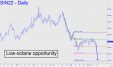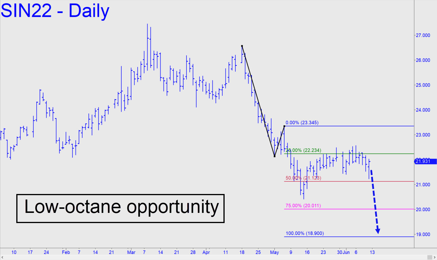 July Silver tripped a promising short at the green line on May 27 that is showing s small profit. Friday’s swoon did not quite reach the red line (p=21.12) where half the position might have been covered ‘by-the-book’, but the trade still looks likely to work. We’ll be better able to judge how likely a further fall to D=18.90 is over the next few weeks, but the A-B impulse leg is steep enough to imply the target will be achieved. _____ UPDATE (Jun 16, 10:36): The short could have been covered for a $6600 profit at p=21.37, but if you still hold a partial position, exit now.